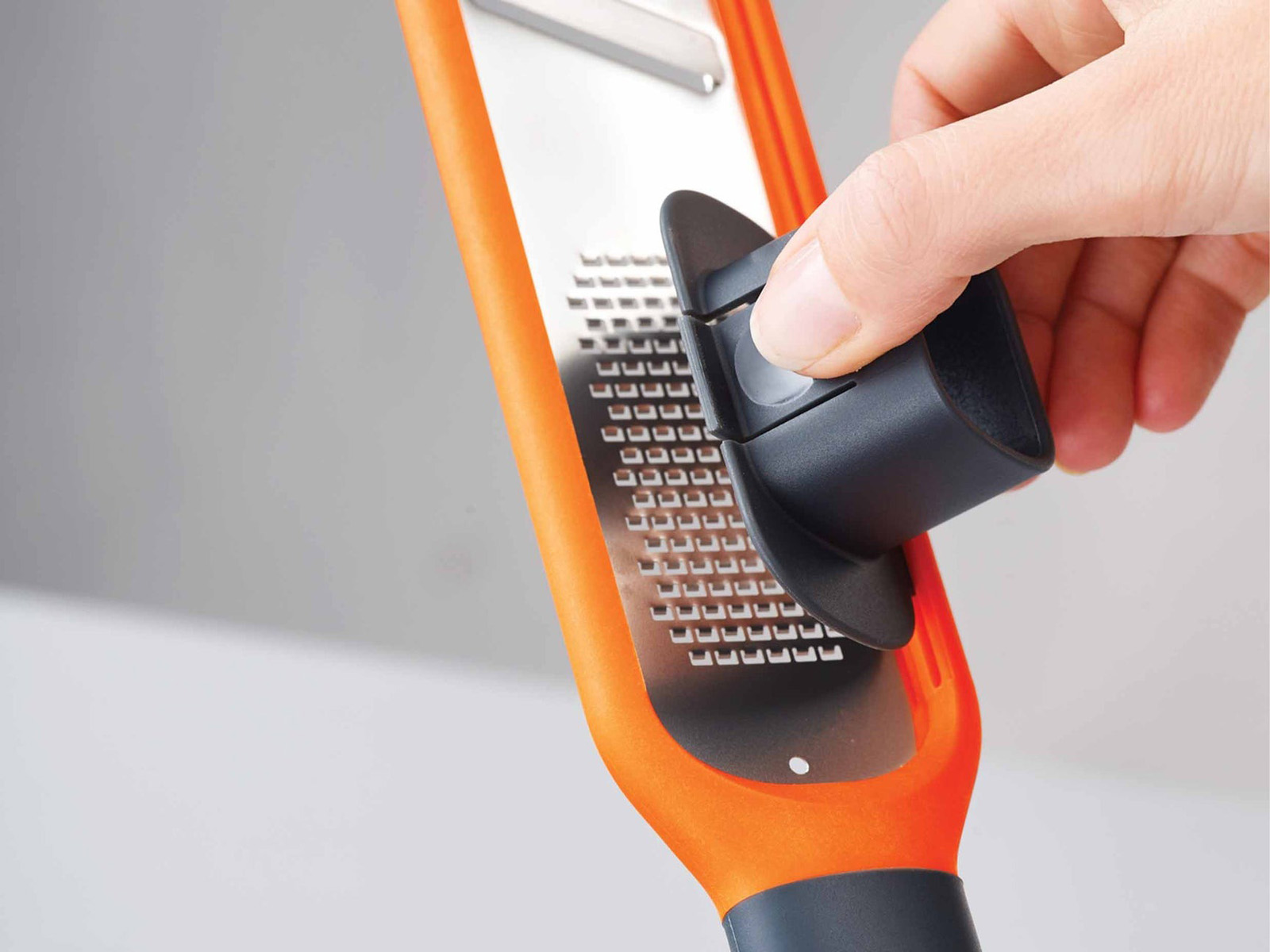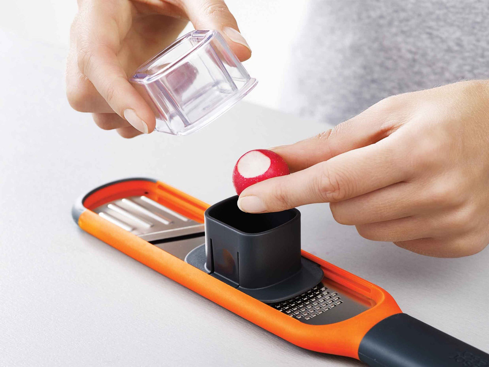 Na powierzchni trącej tarki można zamontować 2-częściową nasadkę do przytrzymywania małych produktów chroniącą palce podczas ścierania i szatkowania.