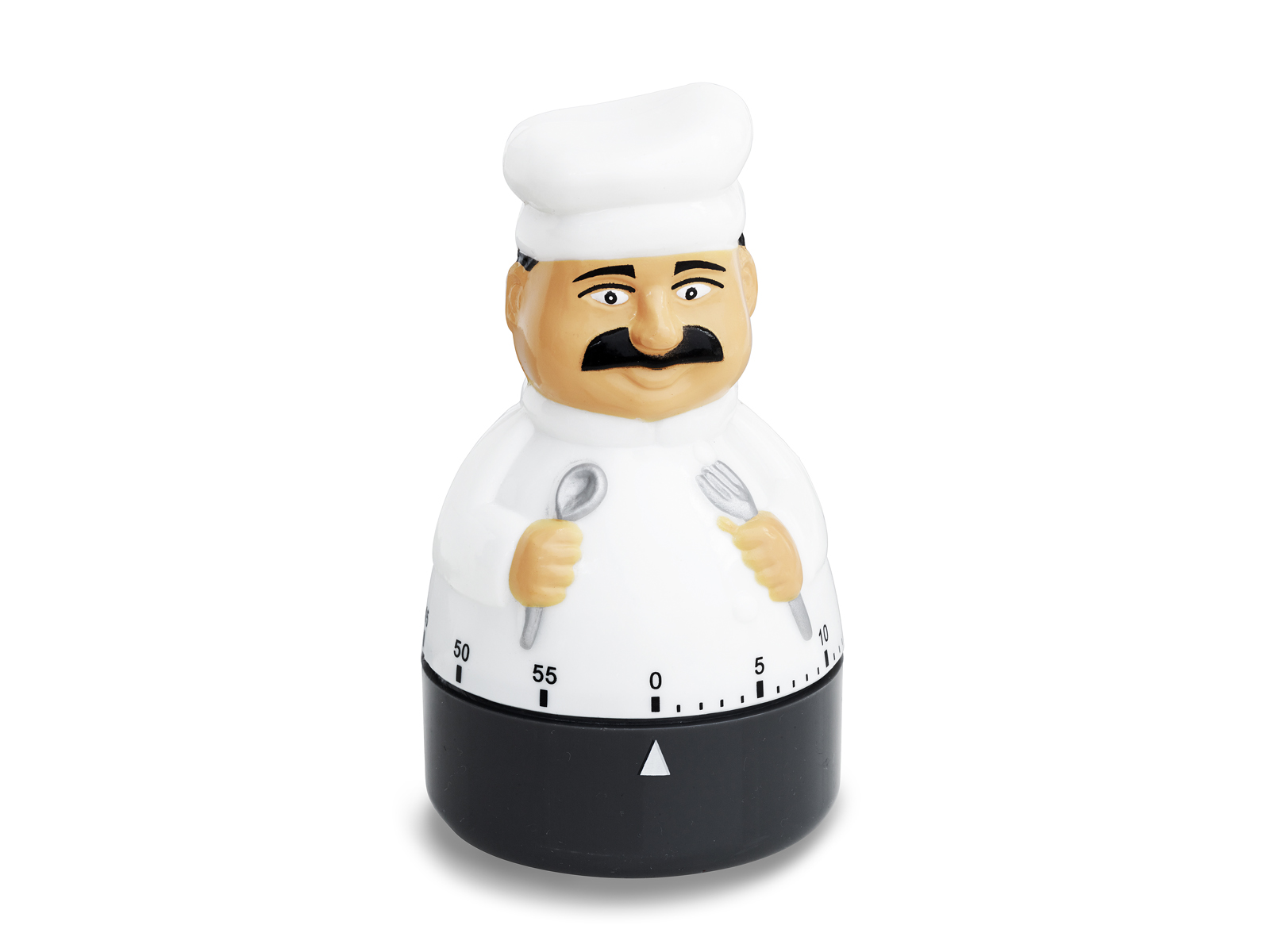Zabawny mechaniczny timer w kształcie postaci kucharza wykonana z lakierowanej stali nierdzewnej.