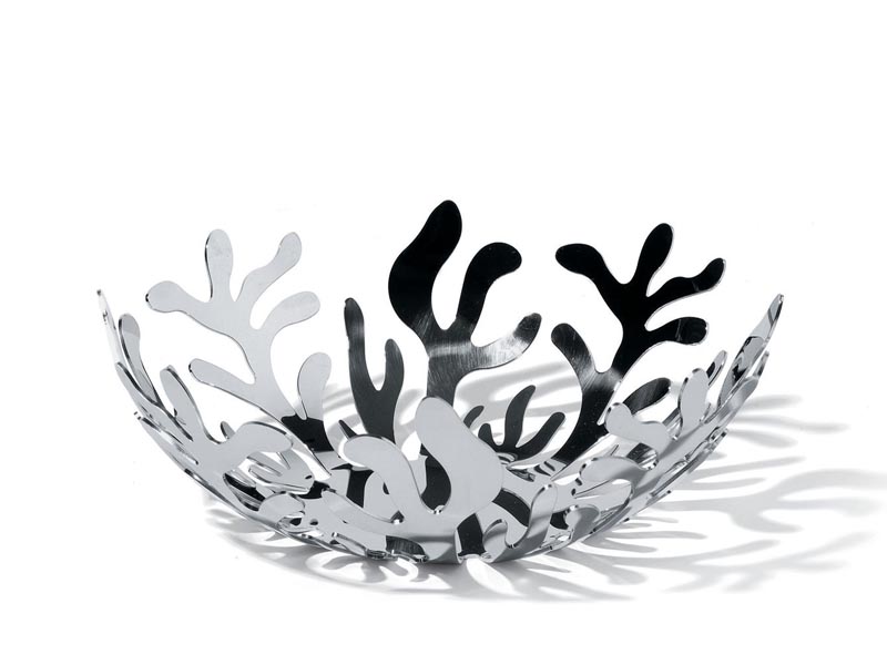 Piękna dekoracyjna misa na owoce o niezwykle oryginalnej ażurowej konstrukcji wykonanej z wysokiej jakości, odpornej na działanie kwasów oraz zarysowania wysokopolerowanej stali nierdzewnej 18/10 o lustrzanej powierzchni.