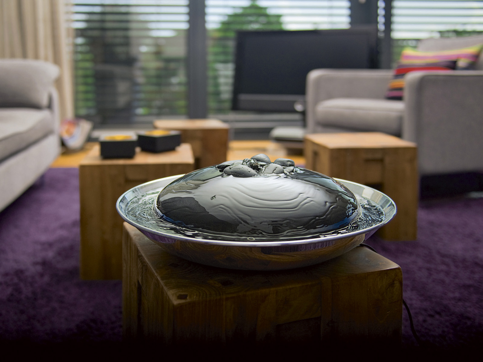 Elegancka dekoracyjna nablatowa fontanna do wnętrz, dzięki spływającej po kamieniach wodzie tworzy nastrojowy klimat relaksu i bliskości natury.