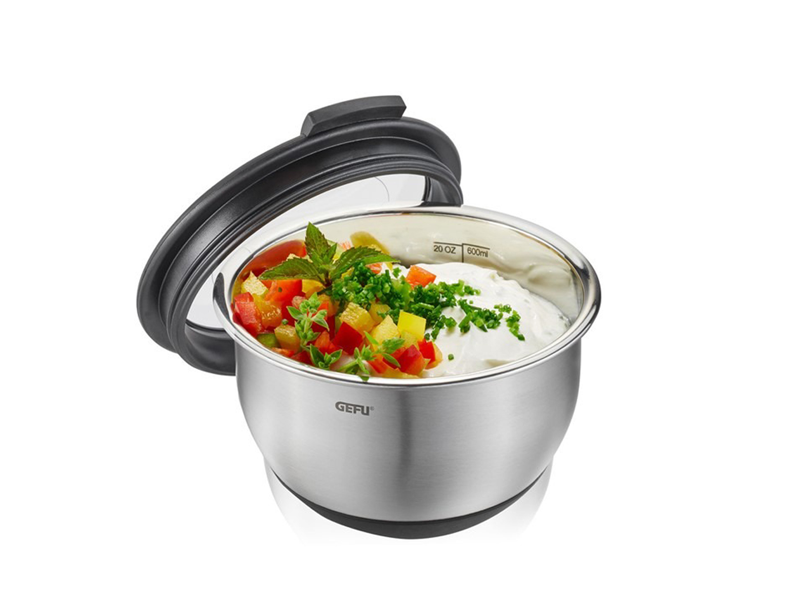 Misa GEFU Muovo to innowacyjne naczynie ze stali nierdzewnej, które przekształca przygotowywanie, przechowywanie i serwowanie dań w prawdziwą przyjemność. Przezroczysta pokrywka z tworzywa sztucznego wyposażona jest w specjalny otwór pozwalający na miksowanie, co zapobiega rozpryskiwaniu się składników oraz pozwala na kontrolę zapełnienia. Misa posiada wewnętrzną skalę pomiarową w mililitrach i uncjach płynnych, która umożliwia precyzyjne odmierzanie składników bez używania dodatkowych naczyń. Antypoślizgowa podstawka z silikonu zapewnia stabilność podczas intensywnego mieszania, a możliwość przechowywania w lodówce czyni misę idealnym naczyniem do wieloetapowego gotowania.