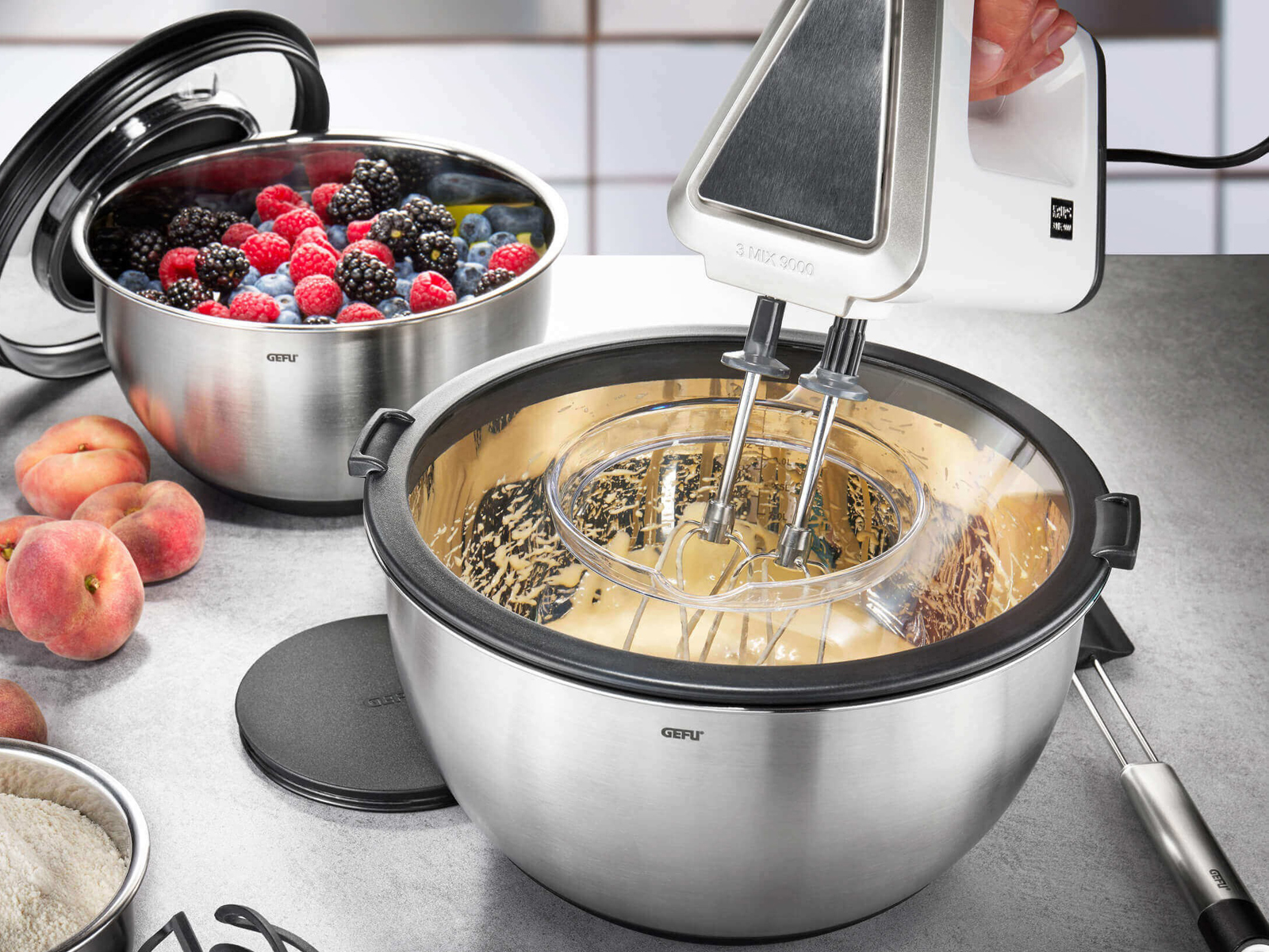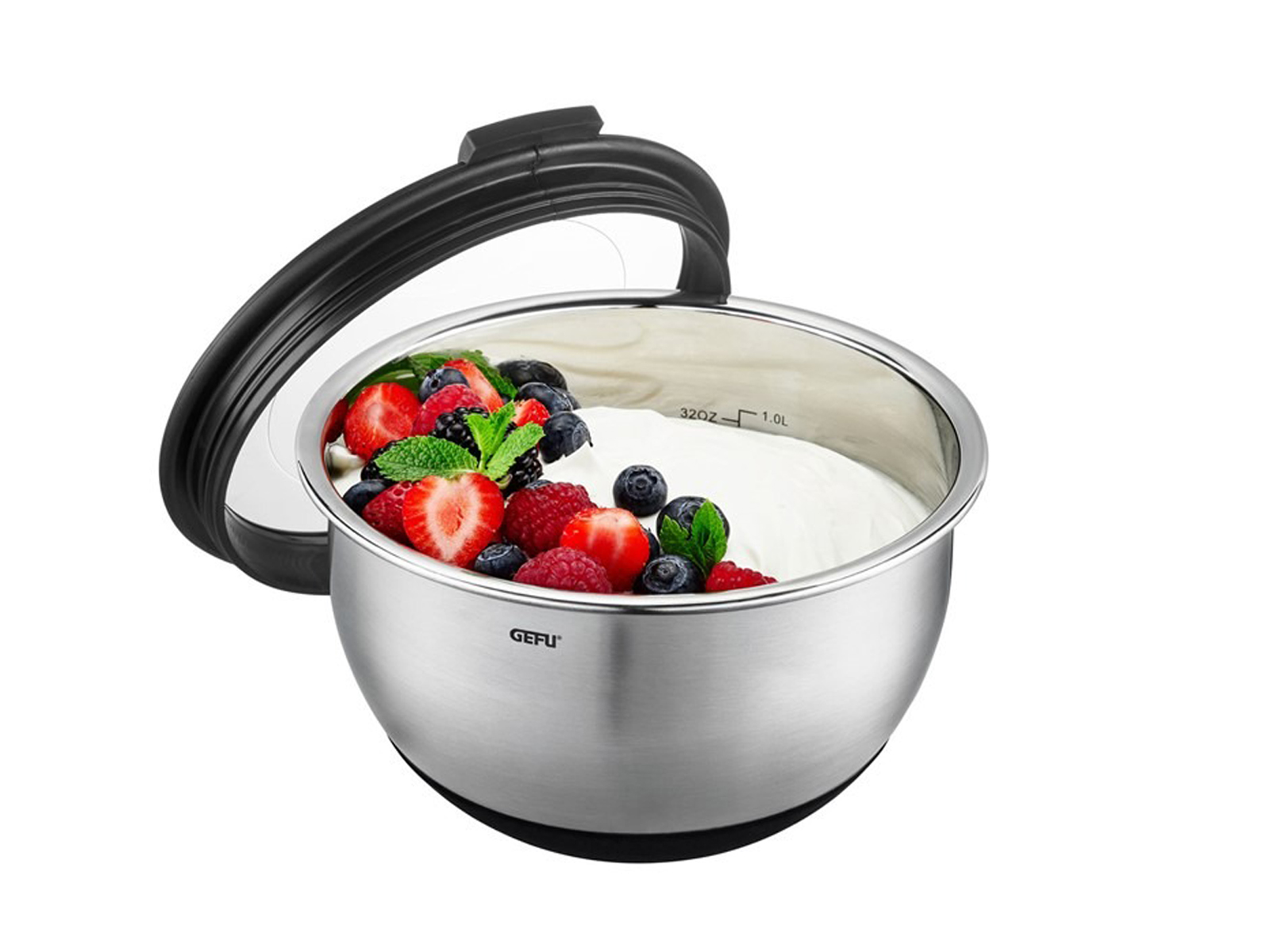 Misa GEFU Muovo to innowacyjne naczynie ze stali nierdzewnej, które przekształca przygotowywanie, przechowywanie i serwowanie dań w prawdziwą przyjemność. Przezroczysta pokrywka z tworzywa sztucznego wyposażona jest w specjalny otwór pozwalający na miksowanie, co zapobiega rozpryskiwaniu się składników oraz pozwala na kontrolę zapełnienia. Misa posiada wewnętrzną skalę pomiarową w mililitrach i uncjach płynnych, która umożliwia precyzyjne odmierzanie składników bez używania dodatkowych naczyń. Antypoślizgowa podstawka z silikonu zapewnia stabilność podczas intensywnego mieszania, a możliwość przechowywania w lodówce czyni misę idealnym naczyniem do wieloetapowego gotowania.