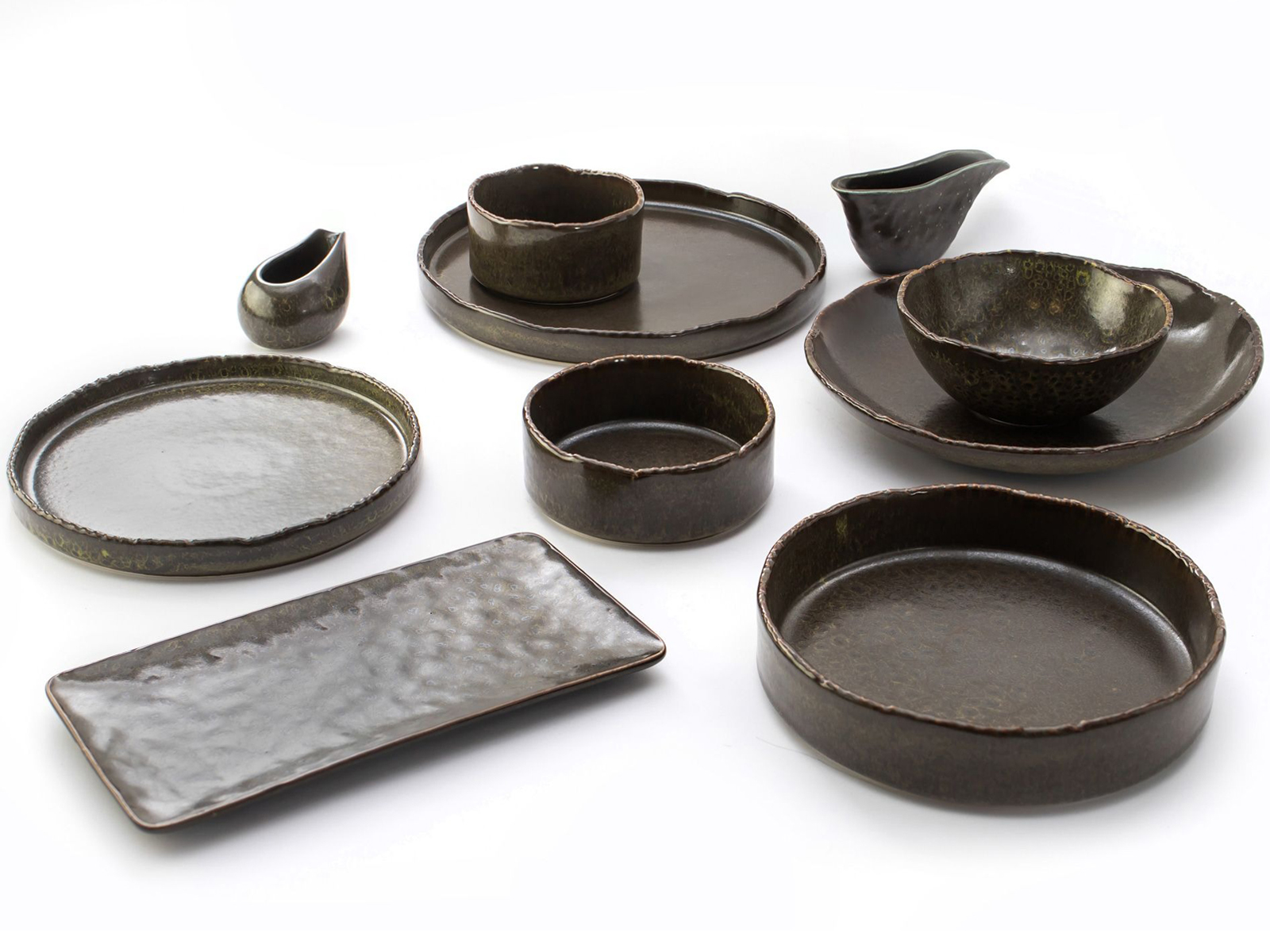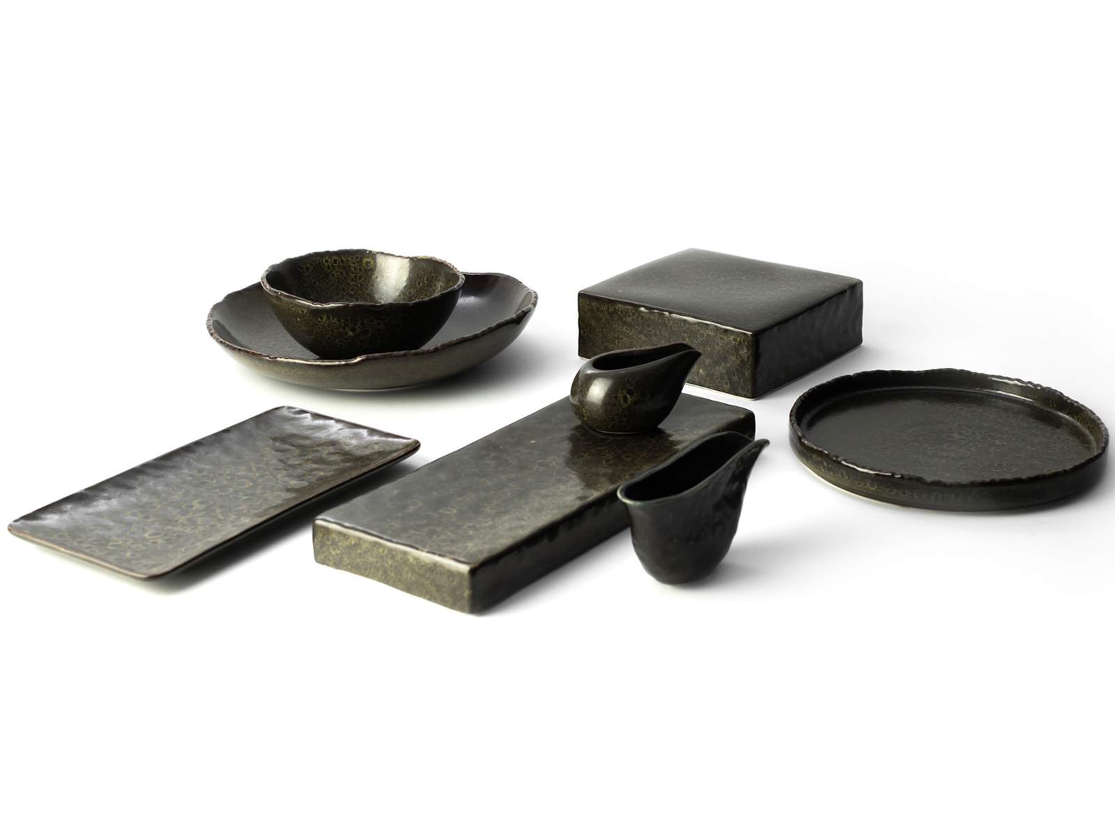 Verlo Alga to kolekcja ręcznie zdobionej porcelany, inspirowana głębinami i roślinnością podwodnego świata. Ciemnozielone odcienie, drobne, okrągłe wzory i pofalowane ranty przywodzą na myśl algi poruszające się w rytmie prądów morskich. Półmatowa powierzchnia w połączeniu z subtelnie nakrapianą glazurą sprawia, że naczynia żyją grą świateł i cieni, niczym fale oceanu za dnia i w nocy. Wszędzie obecne zróżnicowanie faktur i wydłużone kształty mleczników podkreślają organiczny charakter całości. Dzięki reaktywnemu szkliwu każdy element zastawy zyskuje wygląd niepowtarzalnego wyłowionego skarbu.