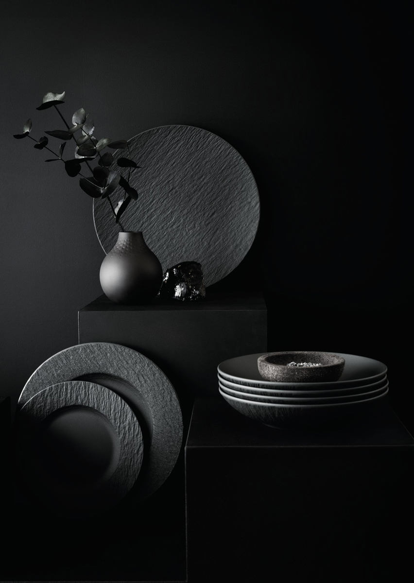 Villeroy&Boch Manufacture Rock Black to wyjątkowa kolekcja niezwykle oryginalnej i niebanalnej zastawy stołowej wykonanej z najwyższej jakości porcelany. Stylistycznie kolekcja inspirowana jest naturalną strukturą kamienia, która, w zależności od elementu kolekcji i jego przeznaczenia, jest wykorzystywana na całej powierzchni naczynia lub tylko na jego cześci. Głębia uzyskanej struktury robi ogromne wrażenie wizualne, a czarny kolor oraz piękna matowa powierzchnia uzupełniają i dopełniają niesamowity efekt.