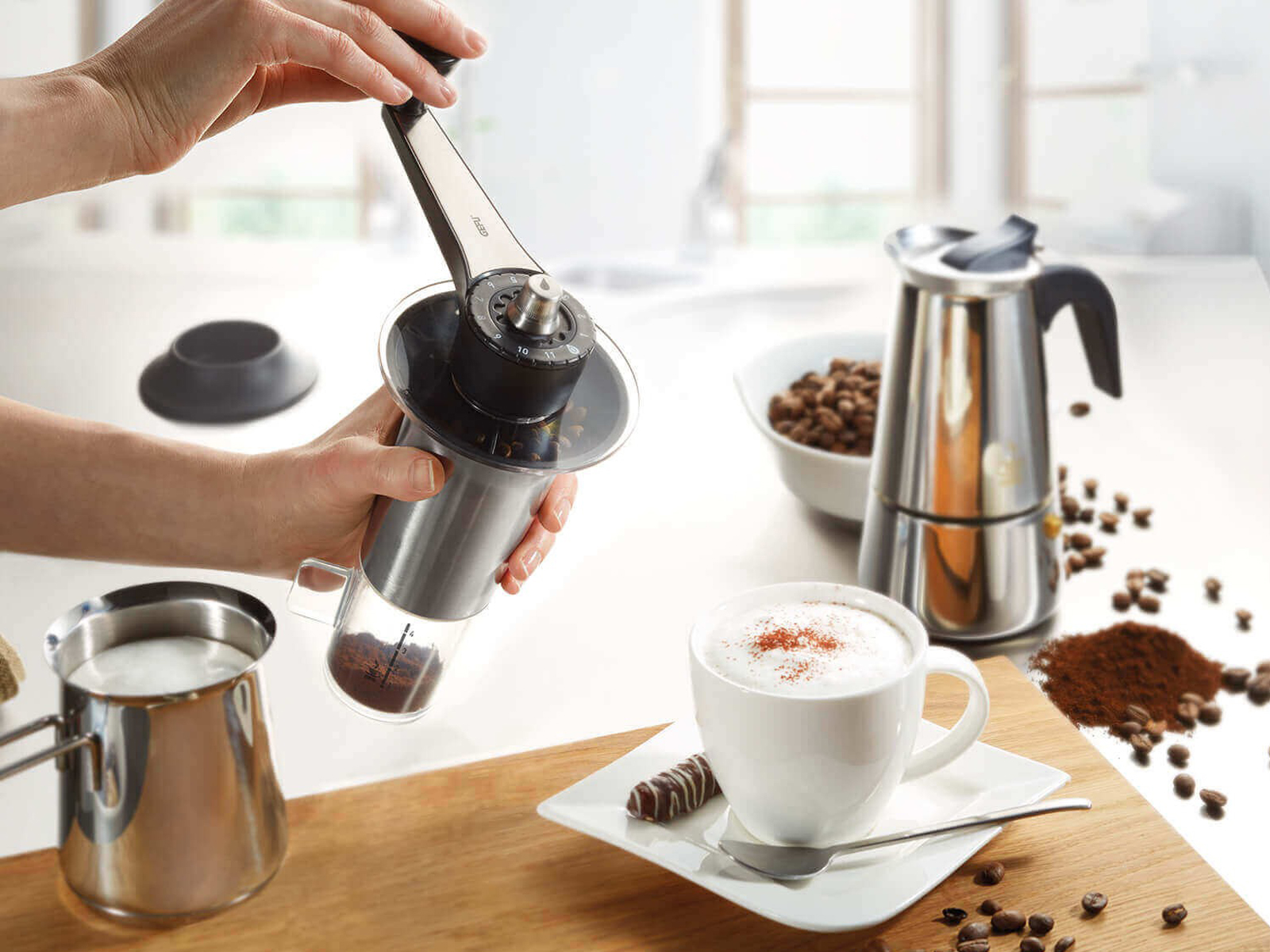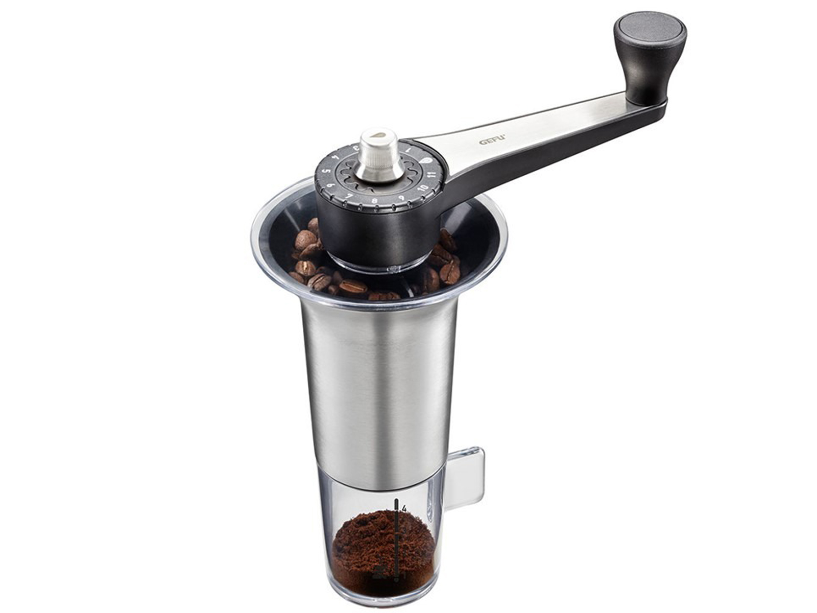 Praktyczny młynek do kawy z regulacją stopnia mielenia i pionową korbą