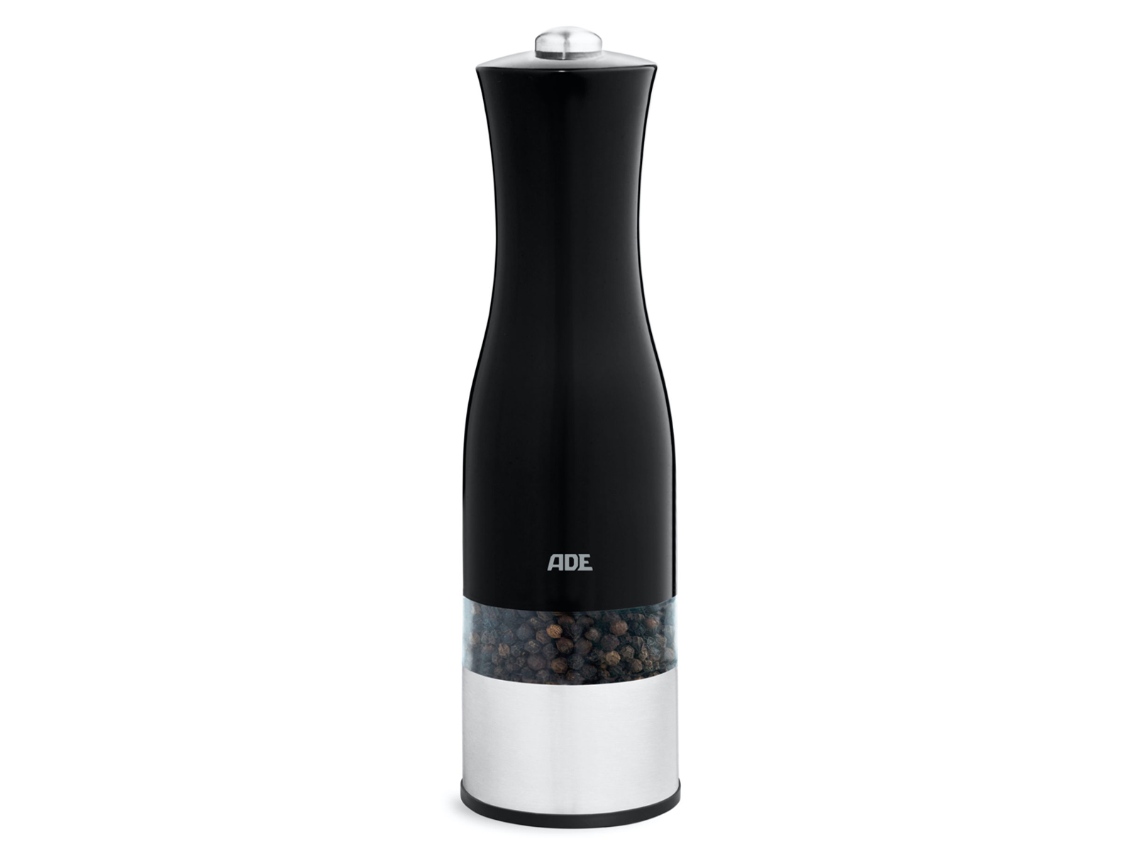 Młynek do pieprzu ADE to wygodne urządzenie aktywowane przyciskiem do ekspresowego przyprawiania dań. Posiada bezstopniową regulację grubości mielenia oraz wytrzymały ceramiczny mechanizm, który rozdrabnia nie tylko pieprz, ale także sól i inne przyprawy. Oświetlenie LED u podstawy młynka włącza się automatycznie podczas mielenia, a podstawka zapobiega osypywaniu się resztek na blat. Przepiękny czarny kolor dodatkowo podkreśla oryginalność akcesorium.