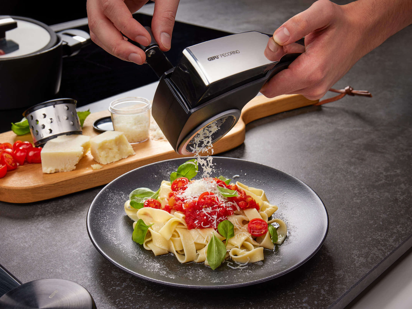 Młynek GEFU Pecorino pozwala z łatwością zmielić nie tylko ser, ale także orzechy czy czekoladę. Dwie wymienne wkładki – drobna i gruba – umożliwiają kontrolę nad stopniem rozdrobnienia składników, a precyzyjne, laserowe cięcie gwarantuje ostrość na długo. Praktyczny, dokręcany pojemnik pozwala zdecydować, czy produkt ma być starty bezpośrednio na potrawę, czy do pojemnika. Możliwość całkowitego demontażu ułatwia czyszczenie ręczne lub w zmywarce i zapewnia wygodne użytkowanie.
