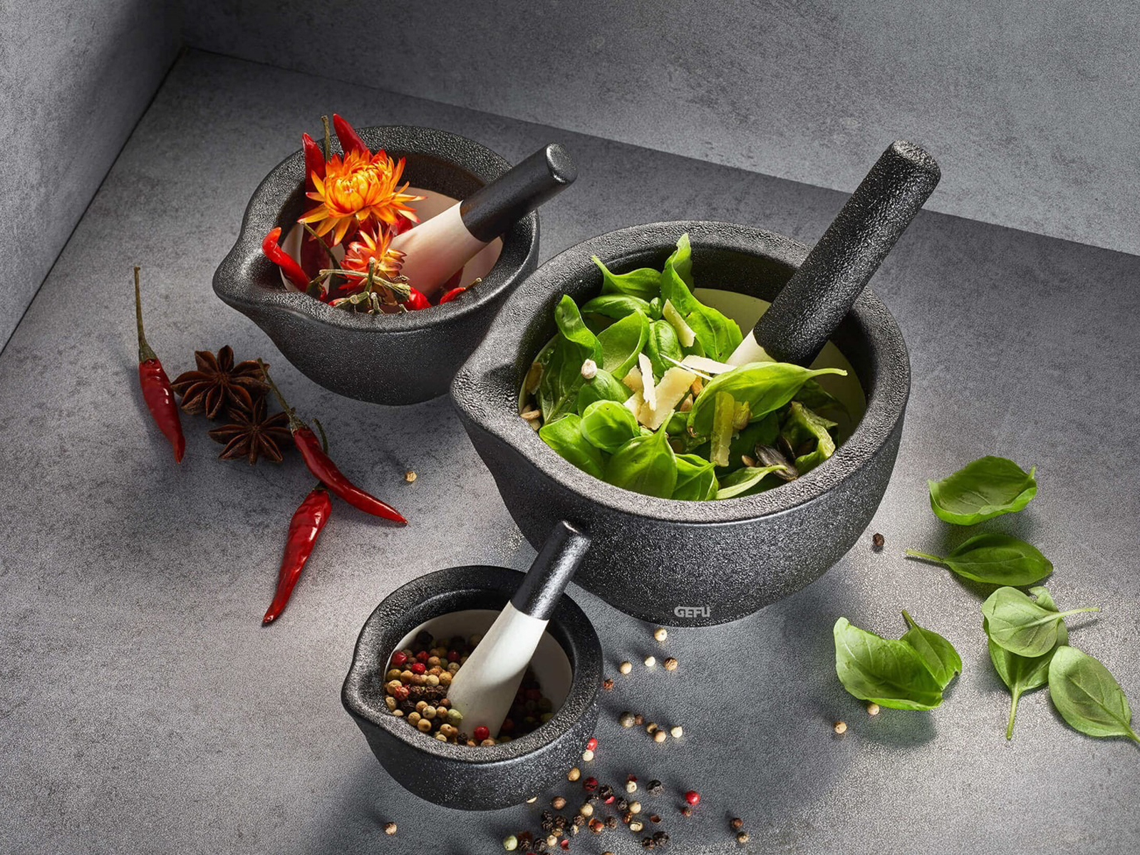 Moździerz GEFU Grino pozwoli na błyskawiczne przygotowanie świeżych ziół do ulubionych potraw.