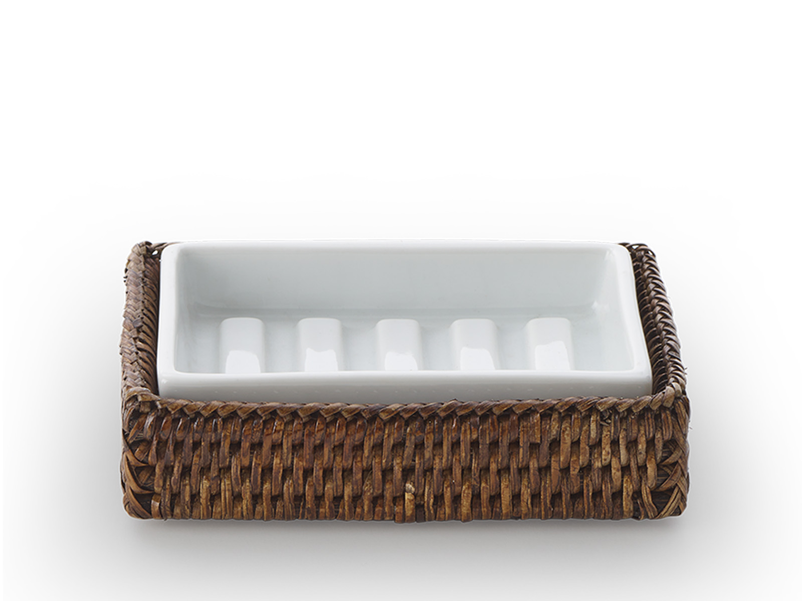Elegancka prostokątna nablatowa mydelniczka wykonana z białej gładkiej porcelany umieszczona w obudowie z naturalnego barwionego ratanu.