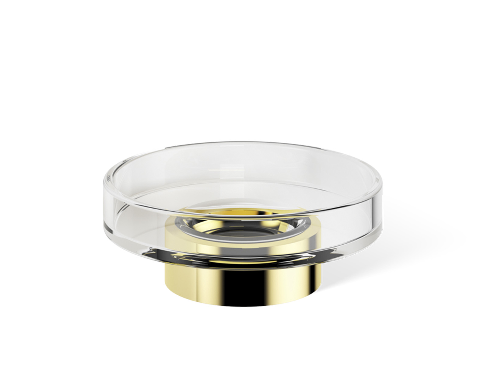 Elegancka nablatowa okrągła mydelniczka wykonana z przezroczystego bezbarwnego szkła kryształowego z mosiężną podstawą.
