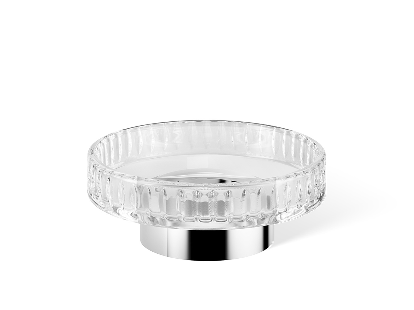 Szklane boki mydelniczki o ciętej powierzchni dodatkowo podkreślają blask załamującego się światła.