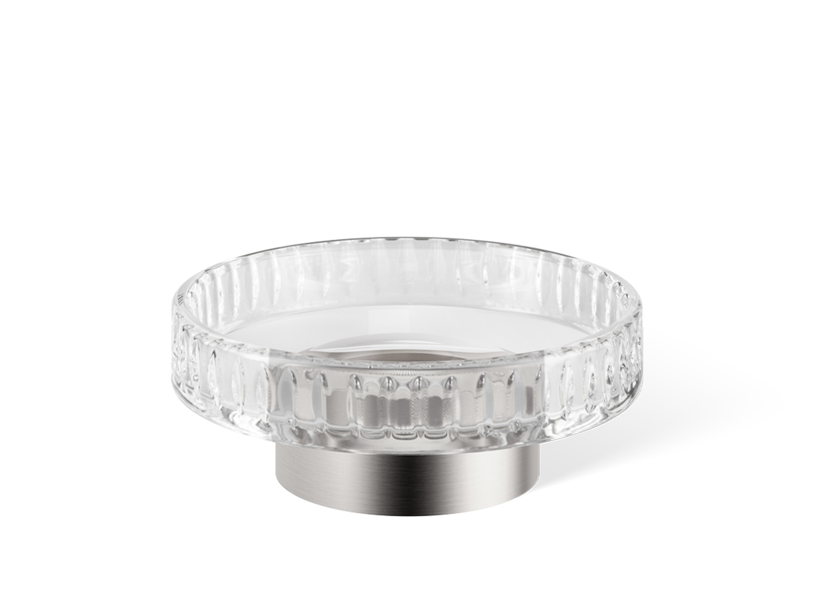 Elegancka nablatowa okrągła mydelniczka wykonana z ciętego przezroczystego bezbarwnego szkła kryształowego z podstawą ze stali nierdzewnej.