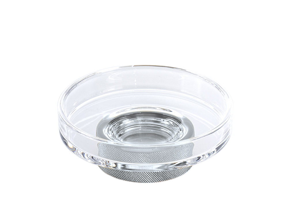 Elegancka okrągła nablatowa mydelniczka wykonana z przezroczystego bezbarwnego szkła kryształowego i podstawie z wysokiej jakości chromowanego mosiądzu.
