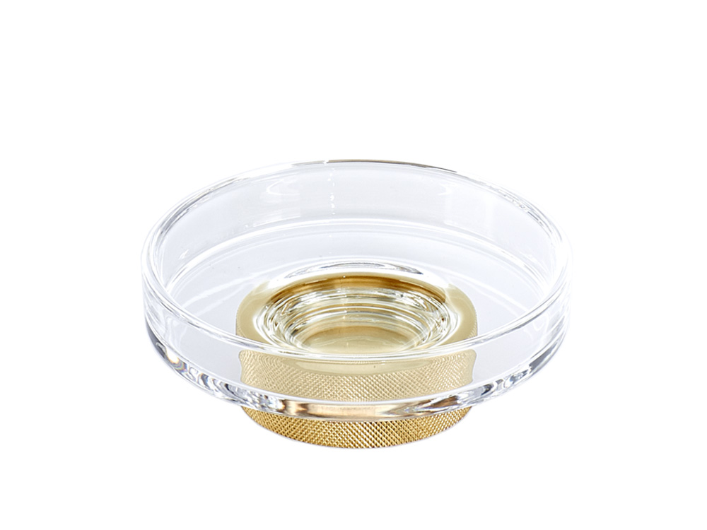 Elegancka okrągła nablatowa mydelniczka wykonana z przezroczystego bezbarwnego szkła kryształowego i podstawie z wysokiej jakości pozłacanego 24-karatowym złotem mosiądzu w wykończeniu matowym.