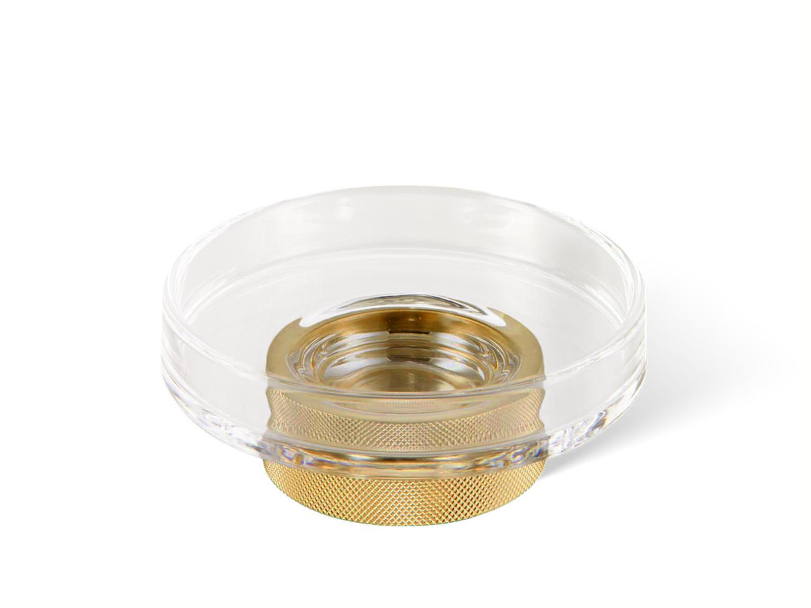 Elegancka okrągła nablatowa mydelniczka wykonana z przezroczystego bezbarwnego szkła kryształowego i podstawie z wysokiej jakości pozłacanego 24-karatowym złotem mosiądzu.