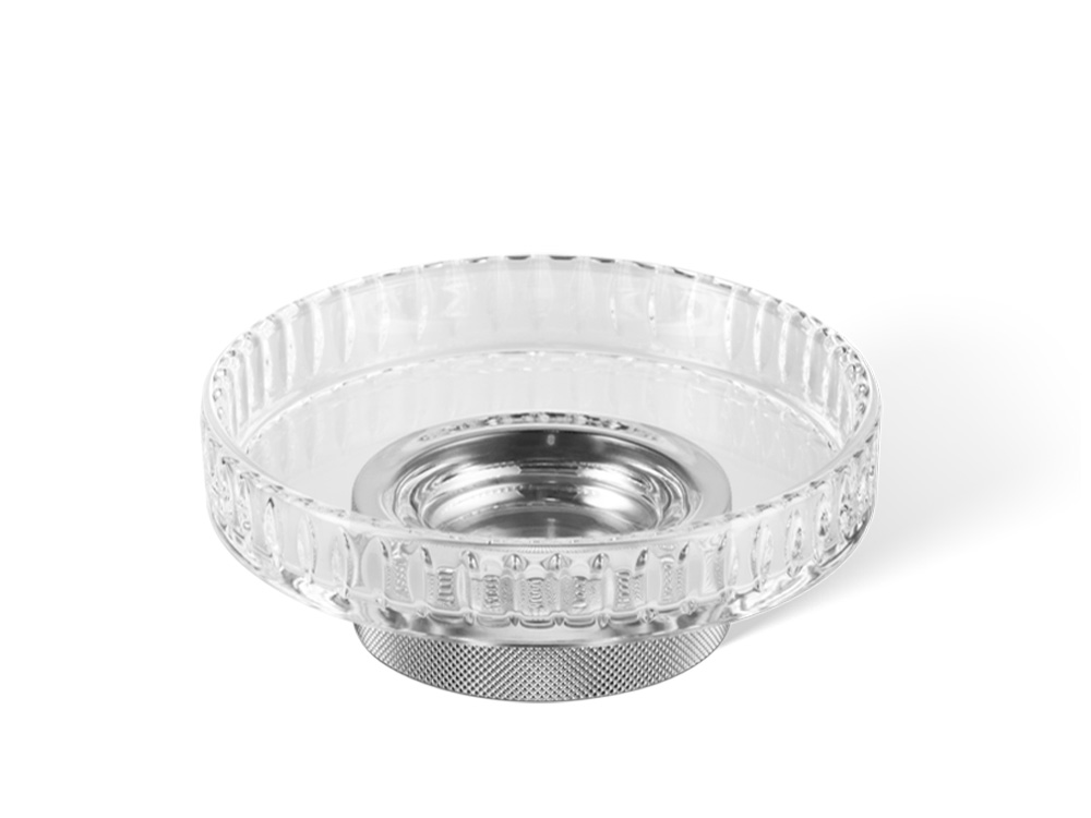 Elegancka okrągła nablatowa mydelniczka wykonana z ciętego bezbarwnego szkła kryształowego i podstawą z wysokiej jakości chromowanego mosiądzu.