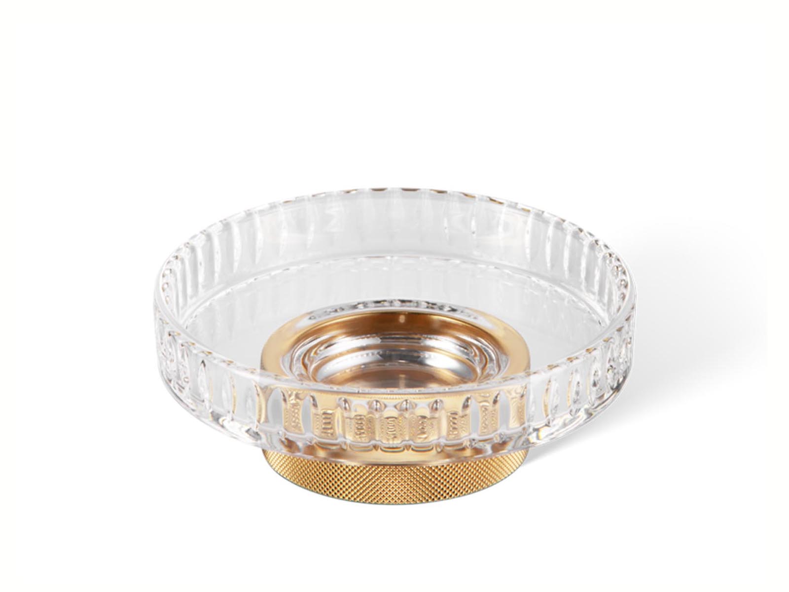 Elegancka okrągła nablatowa mydelniczka wykonana z ciętego bezbarwnego szkła kryształowego i podstawą z wysokiej jakości pozłacanego 24-karatowym złotem mosiądzu.