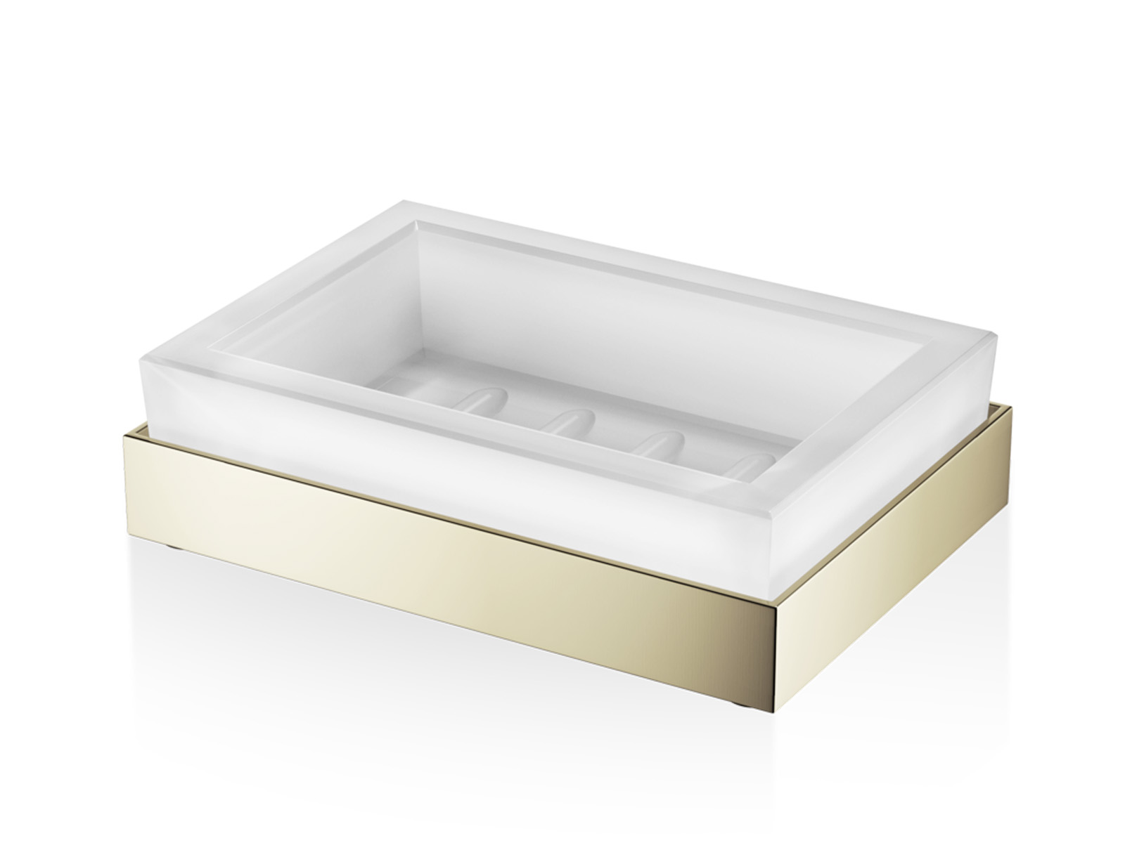 Elegancka solidna prostokątna mydelniczka z matowego białego szkła z mosiężną podstawą.