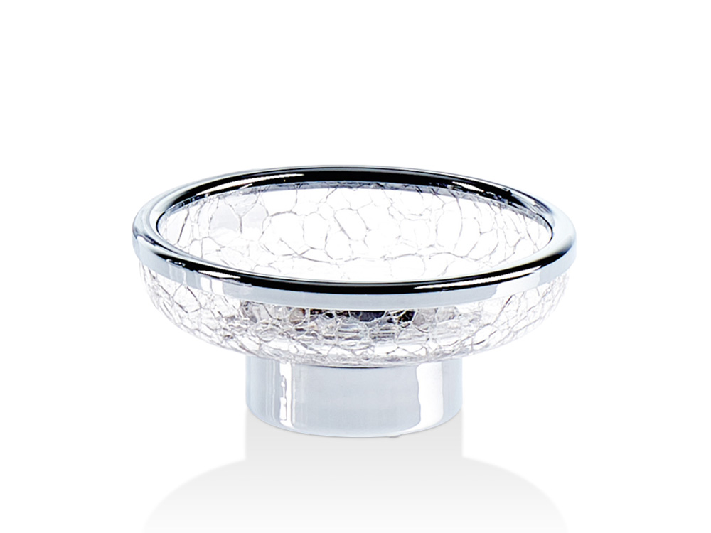 Elegancka okrągła nablatowa mydelniczka wykonana z niezwykle dekoracyjnego przezroczystego szkła "tłuczonego" o charakterystycznym wzorze przypominającym gęstą siatkę pęknięć.