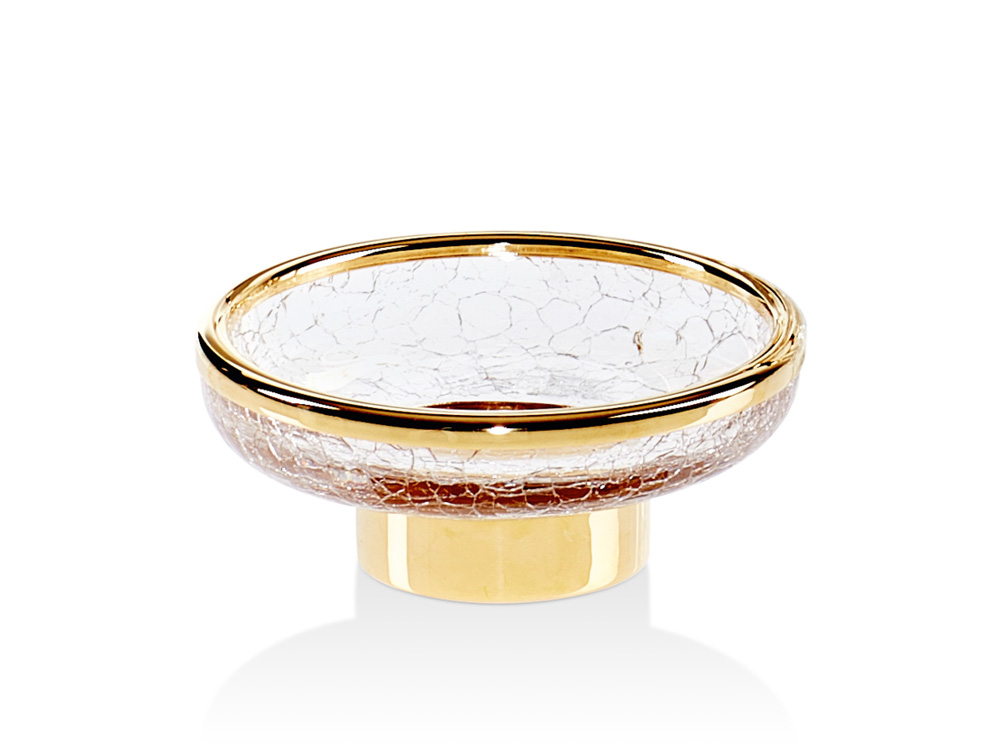 Podstawa mydelniczki oraz wykończenie szklanego brzegu wykonane z wysokiej jakości pozłacanego 24-karatowym złotem mosiądzu.