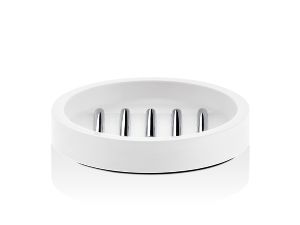 Elegancka okrągła nablatowa mydelniczka wykonana z innowacyjnego, odpornego na uszkodzenia a zarazem przyjaznego dla środowiska kompozytu mineralnego.