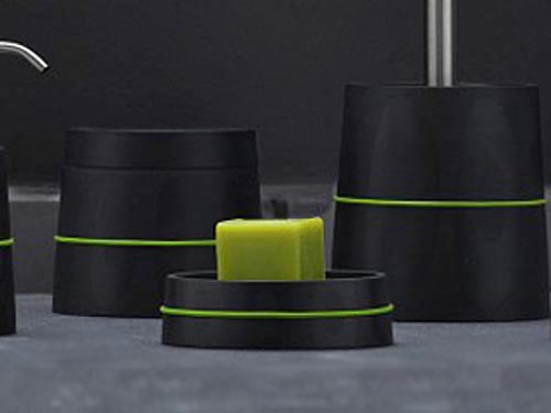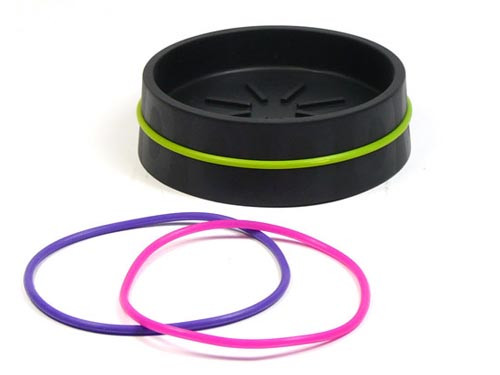 W połowie wysokości mydelniczka posiada wgłębienie na silikonową wymienną opaskę - do mydelniczki dołączone są 3 opaski w kolorze fioletowym, zielonym i różowym, które można wymieniać np. na kolor pasujący do koloru ręczników.
