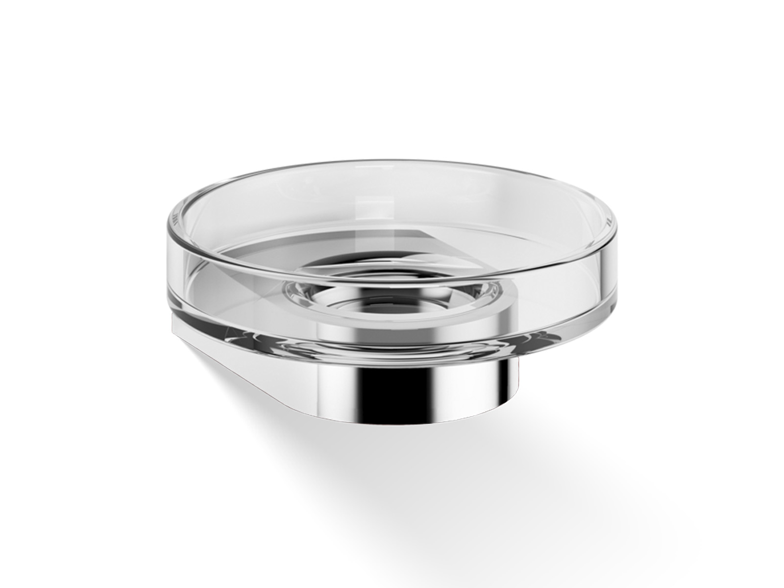 Elegancka okrągła mydelniczka wykonana z przezroczystego szkła kryształowego z mosiężną podstawą mocowaną do ściany.