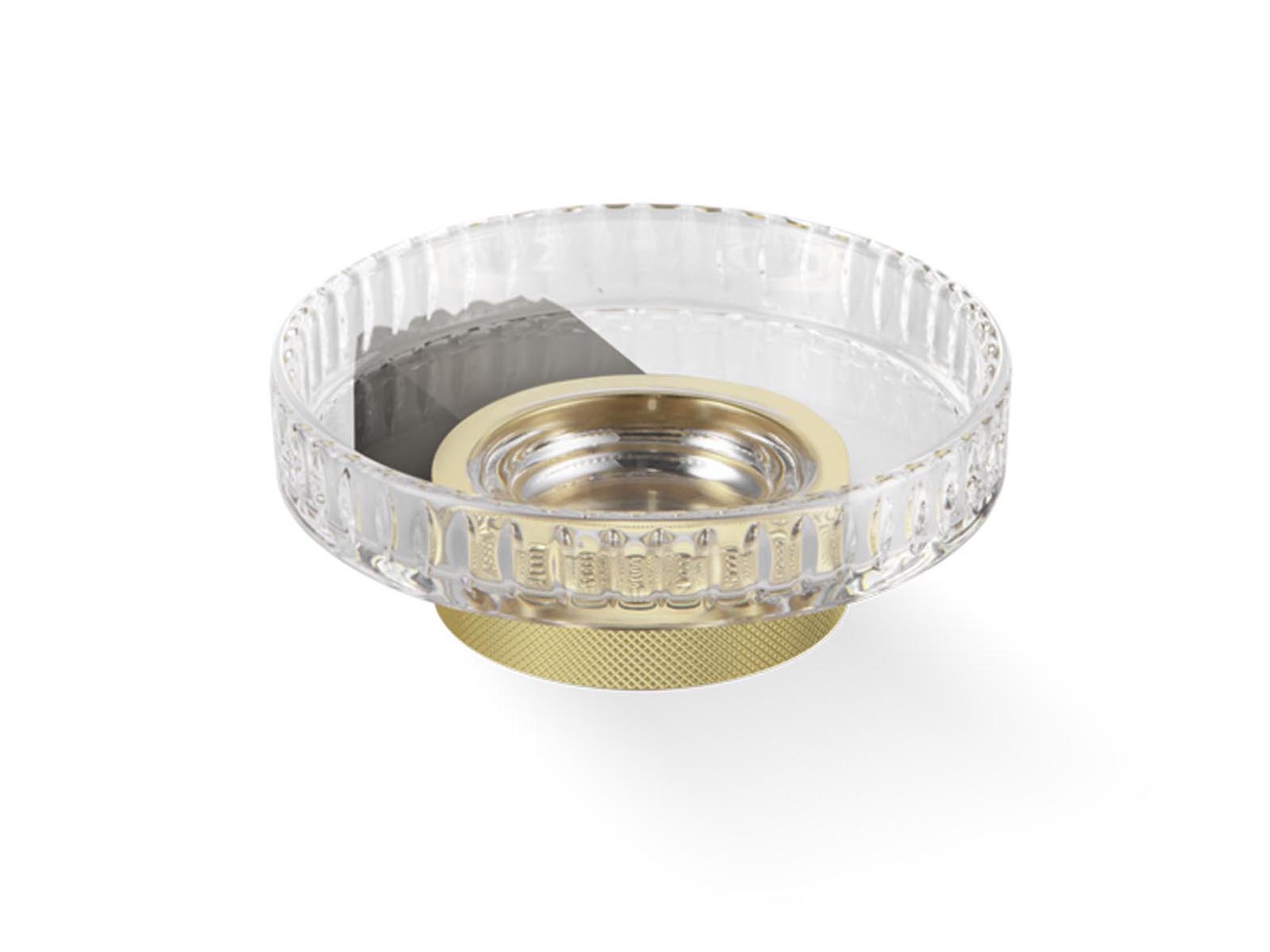 Elegancka okrągła mydelniczka wykonana z ciętego przezroczystego szkła kryształowego z podstawą mocowaną do ściany.