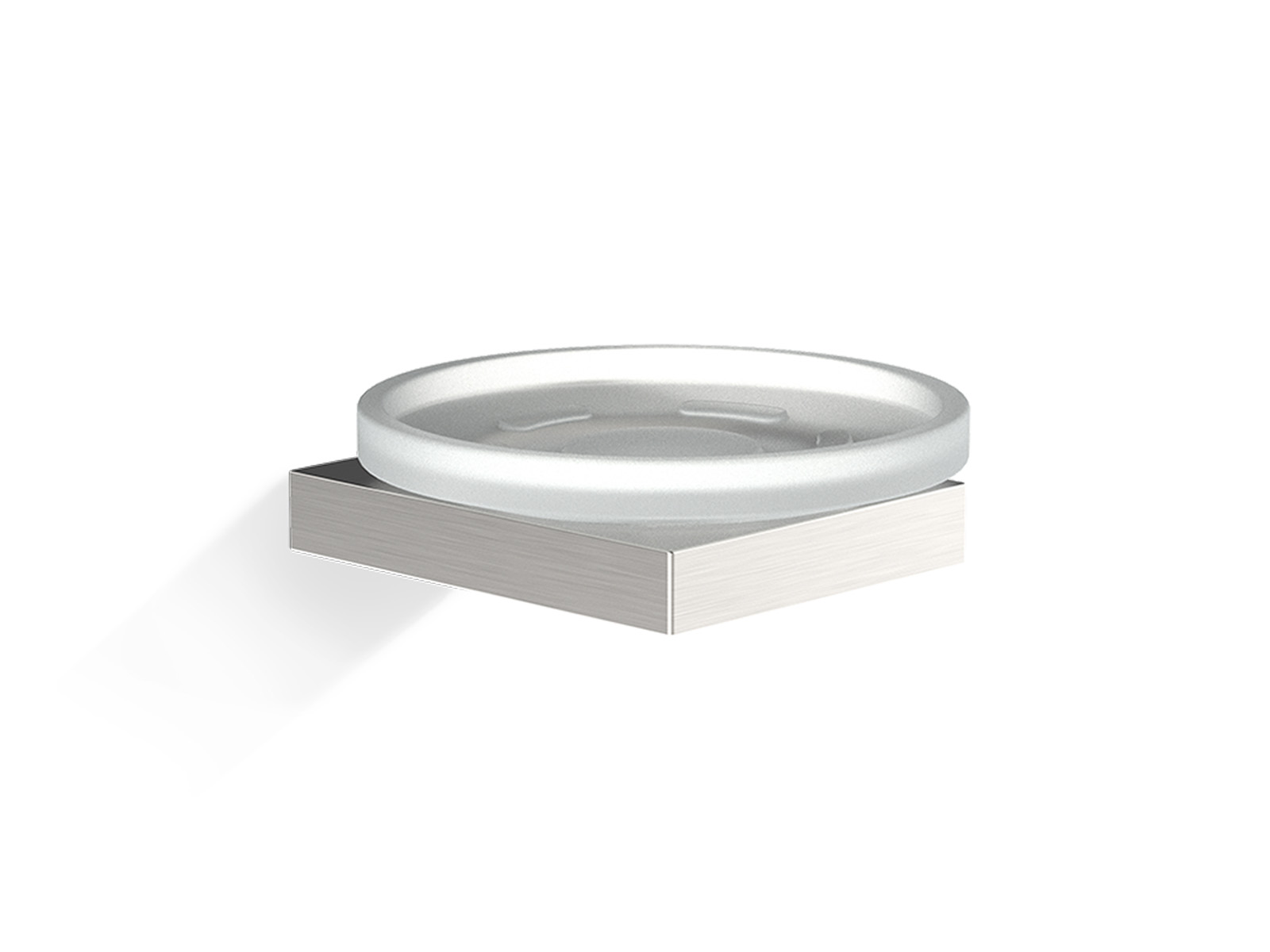 Elegancka okrągła szklana mydelniczka umieszczona na prostokątnej podstawie montowanej do ściany.