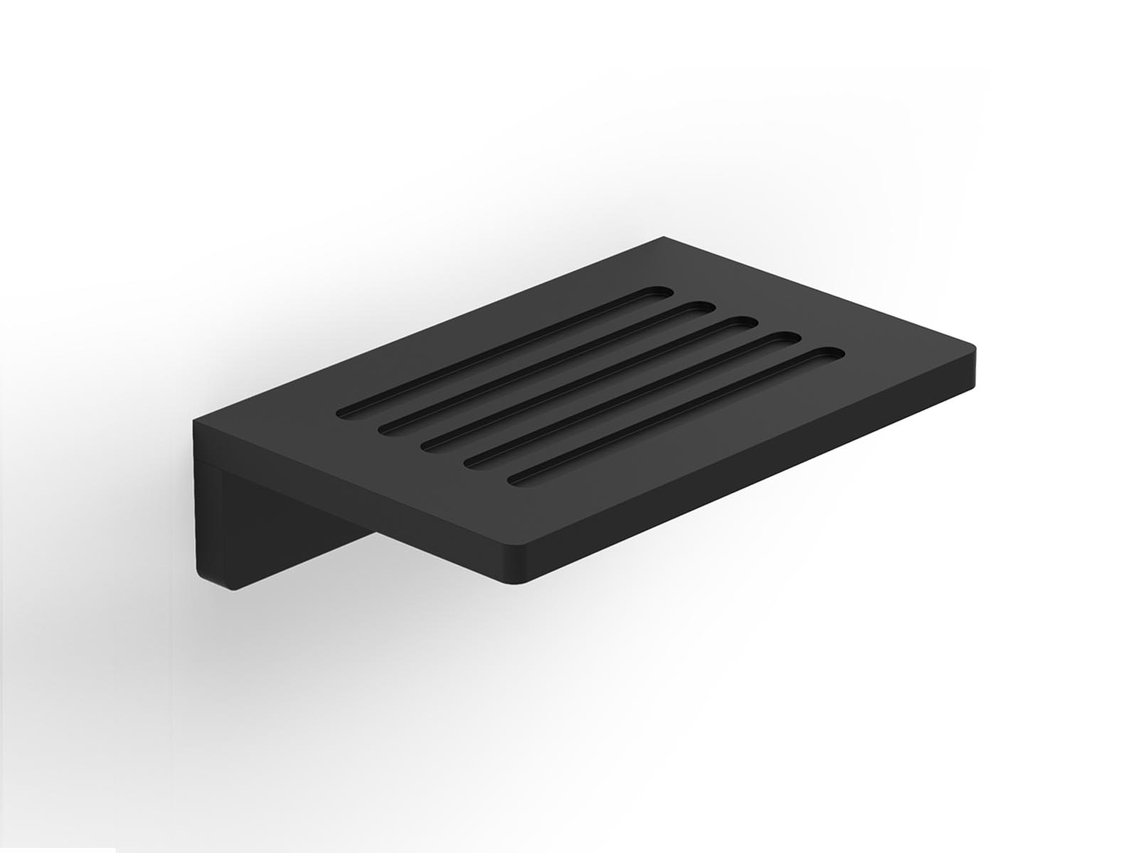 Elegancka nablatowa mydelniczka łazienkowa z prostopadłym do ociekacza wygiętym w dół uchwytem mocowanym do ściany.