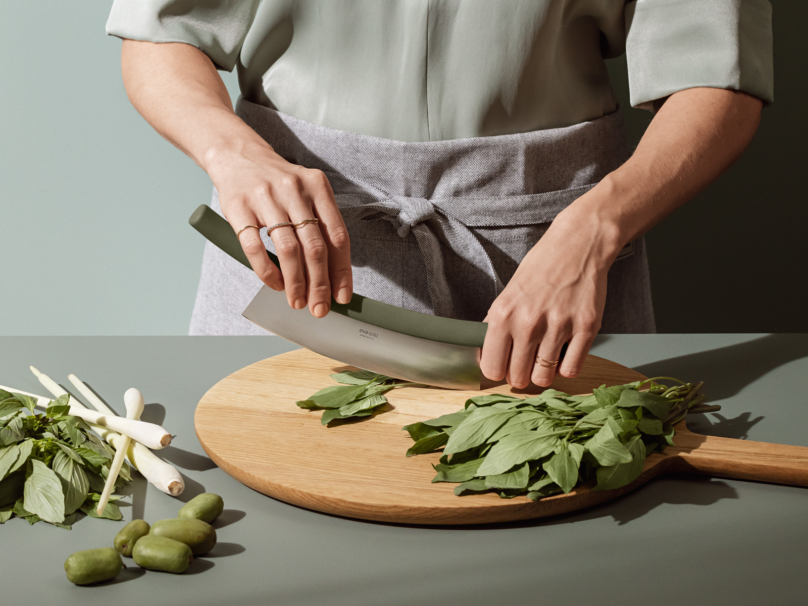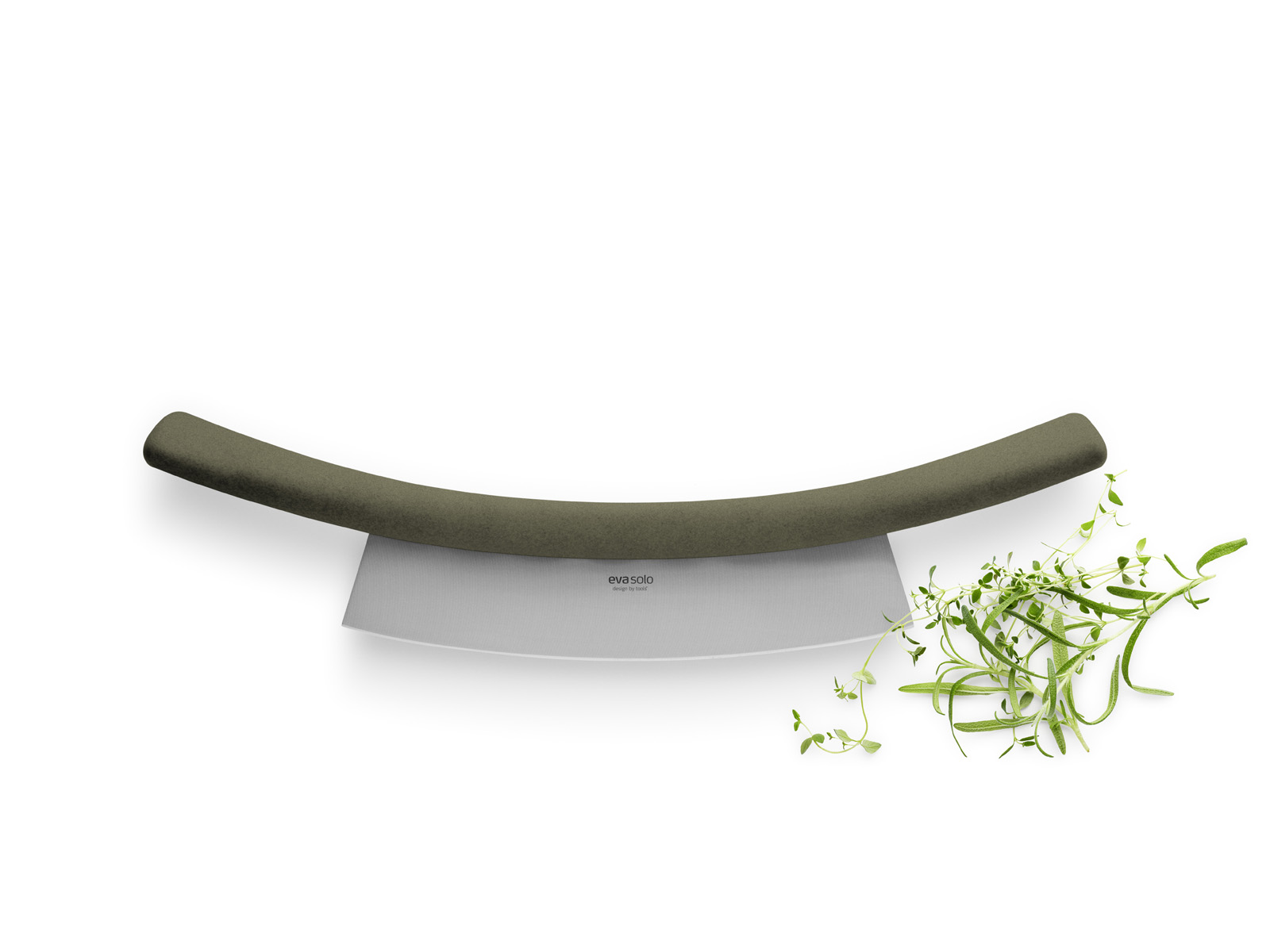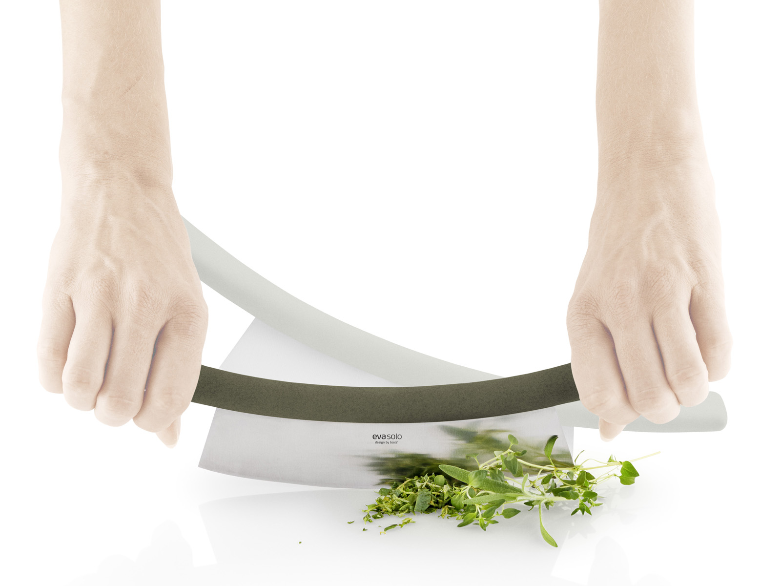 Oryginalny i funkcjonalny profilowany stalowy nóż ułatwiający krojenie świeżych ziół i warzyw.