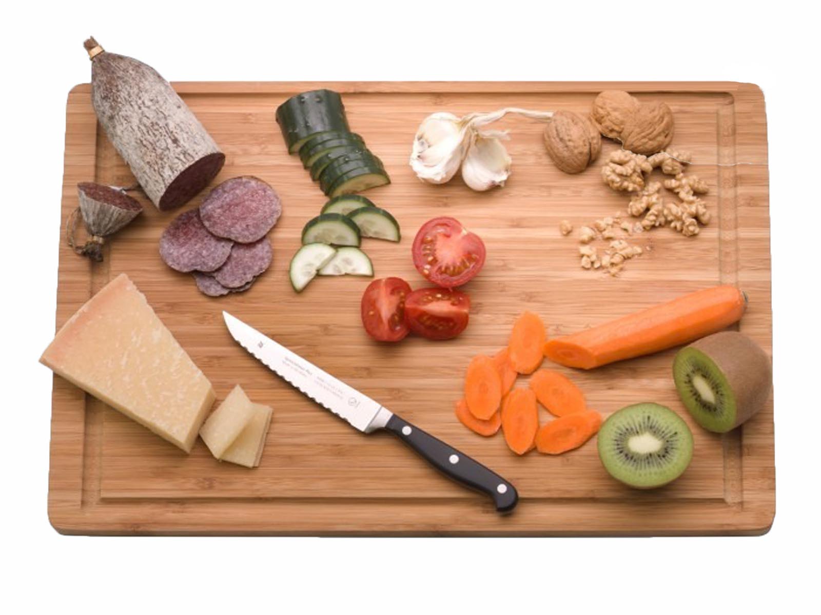 Elegancki ostry i wytrzymały kuchenny nóż uniwersalny z serii Spitzenklasse Plus do bezwysiłkowego krojenia wszelkiego rodzaju mniejszych produktów spożywczych od surowych warzyw i owoców po suszoną kiełbasę.