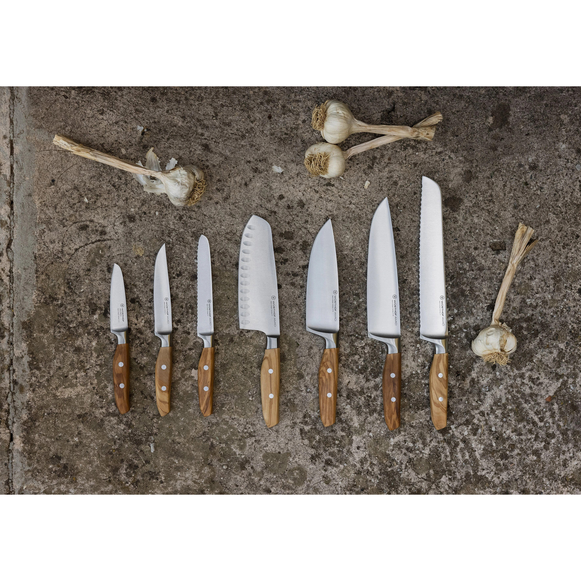 Wusthof Amici to unikalna kolekcja ekskluzywnych noży kuchennych. Noże Amici kute są z jednego kawałka stali nierdzewnej i osiągają stopeiń 58 HRC w skali Rockwella.