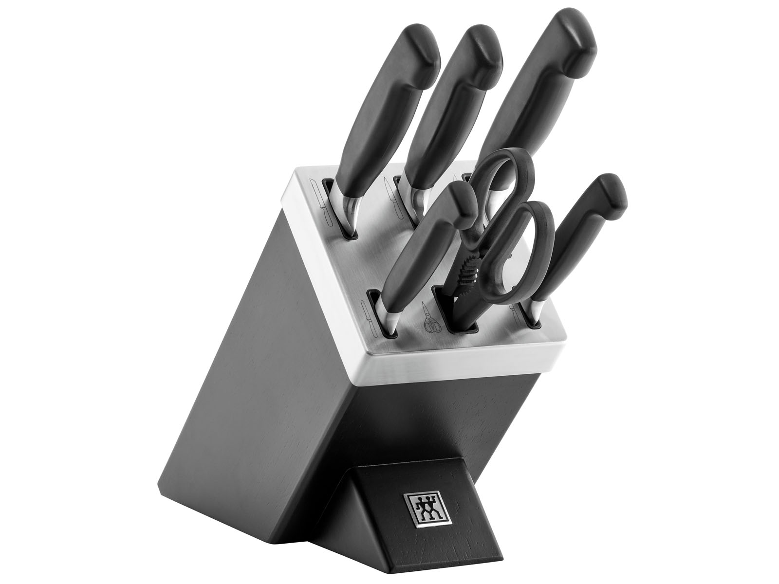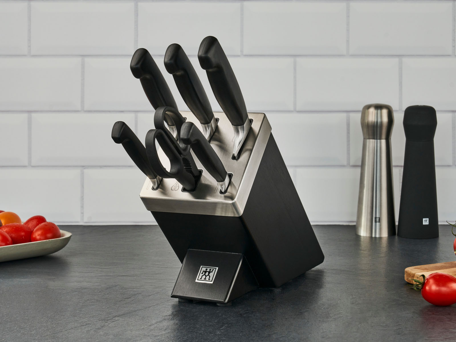 Zwilling Four Star to unikalna kolekcja ekskluzywnych i bardzo praktycznych noży kuchennych. Noże Four Star zachwycają ponadczasowymi uchwytami z wysokiej jakości tworzywa sztucznego, których idealne wyważenie i płynne przejścia usprawniają pracę i pielęgnację. Dzięki laserowej metodzie ostrzenia noże są idealnie ostre na całej długości. Idealne dopasowanie uchwytu i ostrza beż zbędnych dodatkowych elementów zapobiega gromadzeniu się resztek żywności, a jelec przy łączeniu zapewnia bezpieczeństwo dłoniom.