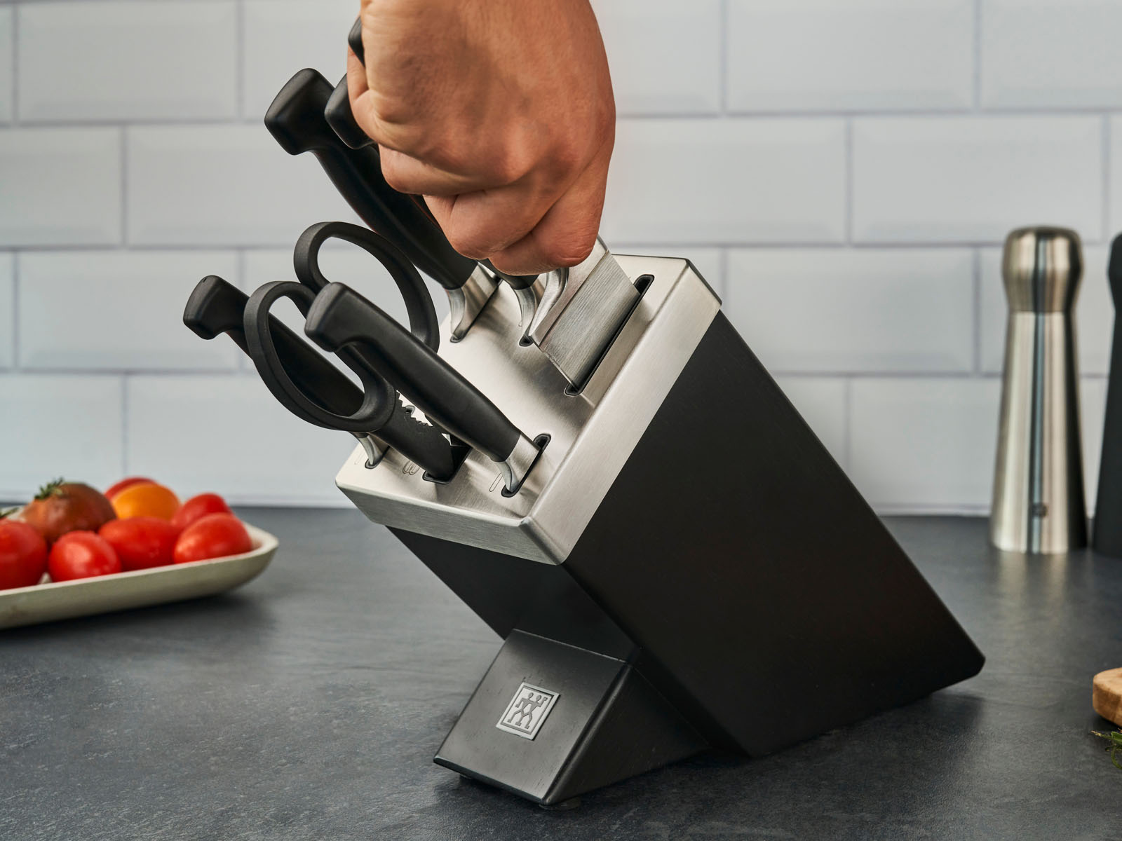 Dzięki samoostrzącemu blokowi hartowane lodem ostrza noży będą niezmiennie ostre, zachowując perfekcyjne właściwości tnące przez cały czas użytkowania. Zintegrowana technologia KIS (Keep It Sharp) sprawia, że nie ma konieczności dodatkowego ostrzenia. Przy każdym włożeniu noża do bloku, klingi ostrzyć się będą automatycznie.