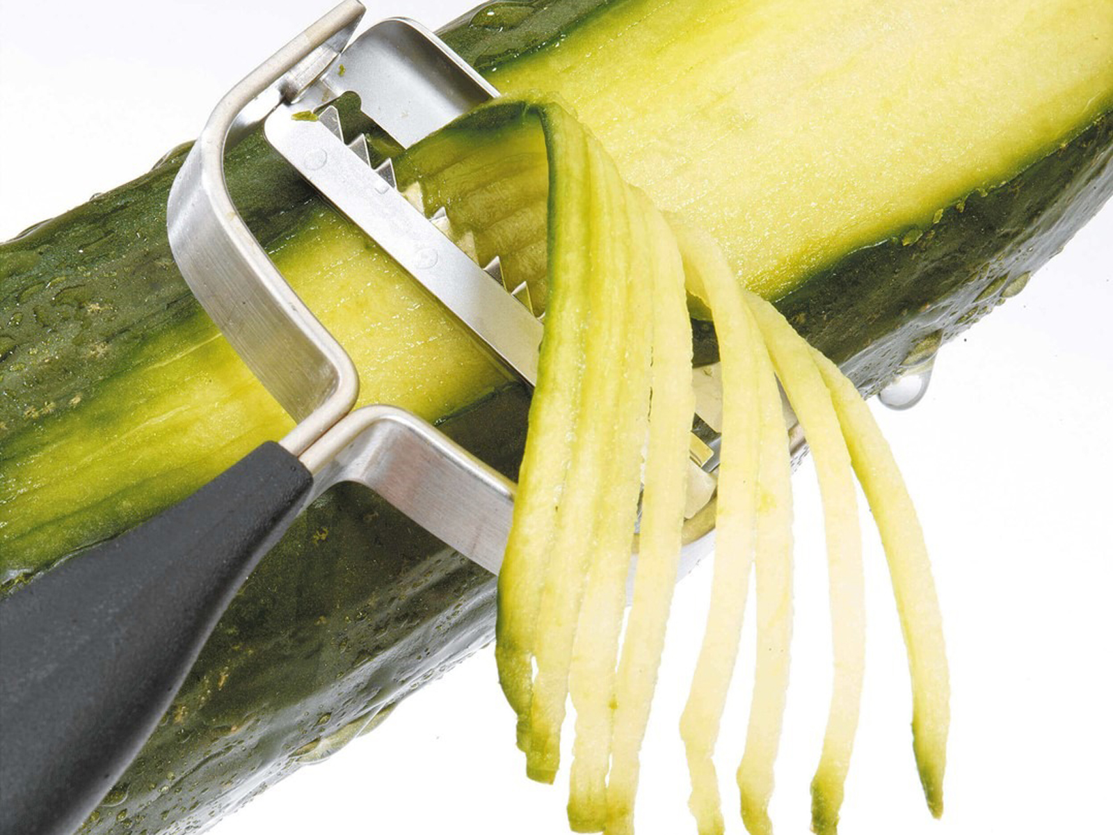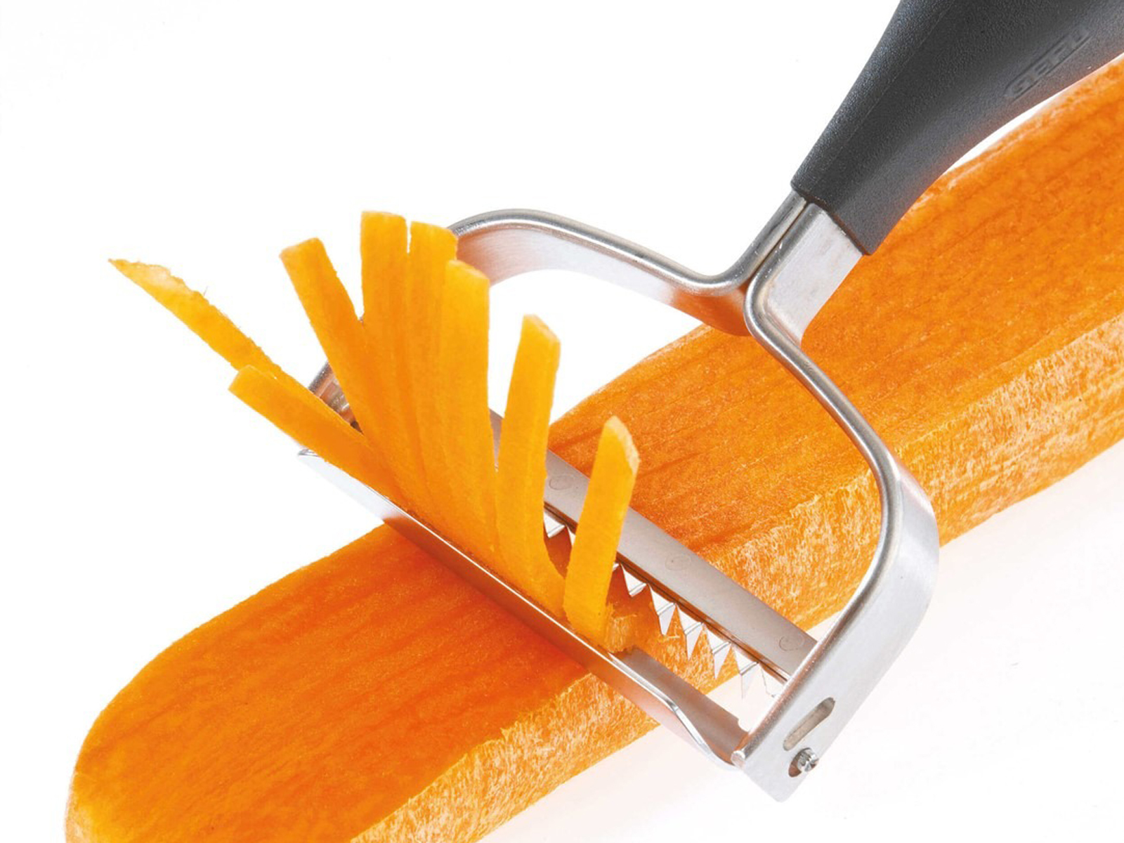 Obieraczka GEFU Striscia pozwala w prosty sposób przygotować długie i cienkie paski julienne z marchwi, ogórka, rzodkiewki i innych warzyw. Sprawdzi się również przy rozmaitych owocach. Ostra krawędź z japońskiej stali nierdzewnej umożliwia zarówno obieranie, jak i precyzyjne cięcie składników, co sprawia, że krajalnice nie są już potrzebne. Ergonomiczny uchwyt zapewnia wygodne trzymanie w dłoni, co czyni pracę szybszą i bardziej komfortową.