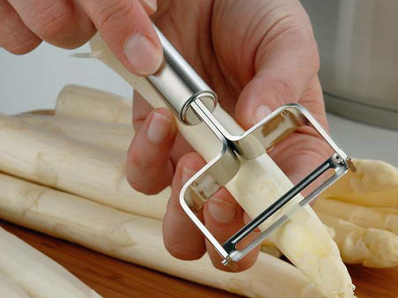 Elegancka i praktyczna kuchenna obieraczka z poprzecznym ostrzem do szczególnie cienkiego obierania owoców i warzyw np. jabłek, mango, ogórków, marchwi, ziemniaków czy szparagów.