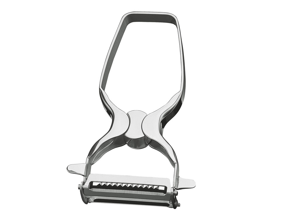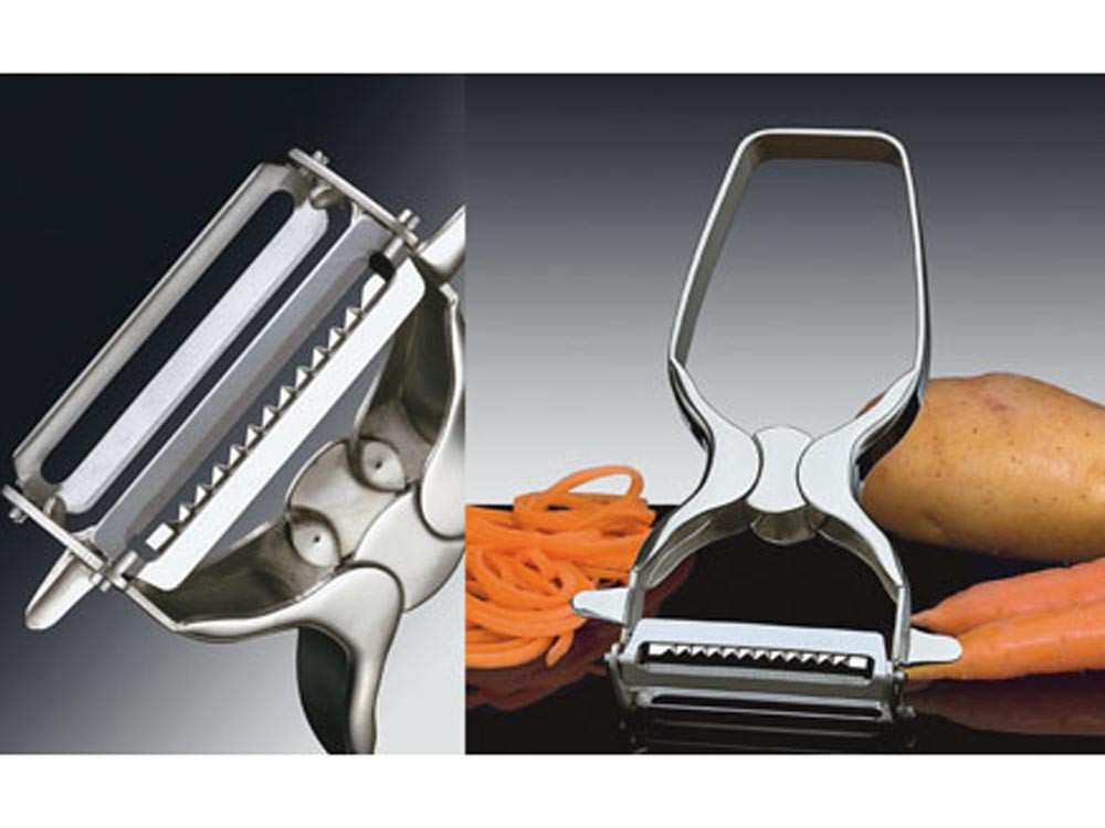 Elegancki i praktyczny metalowy obierak do owoców i warzyw oraz krajacz do warzyw julienne w jednym.