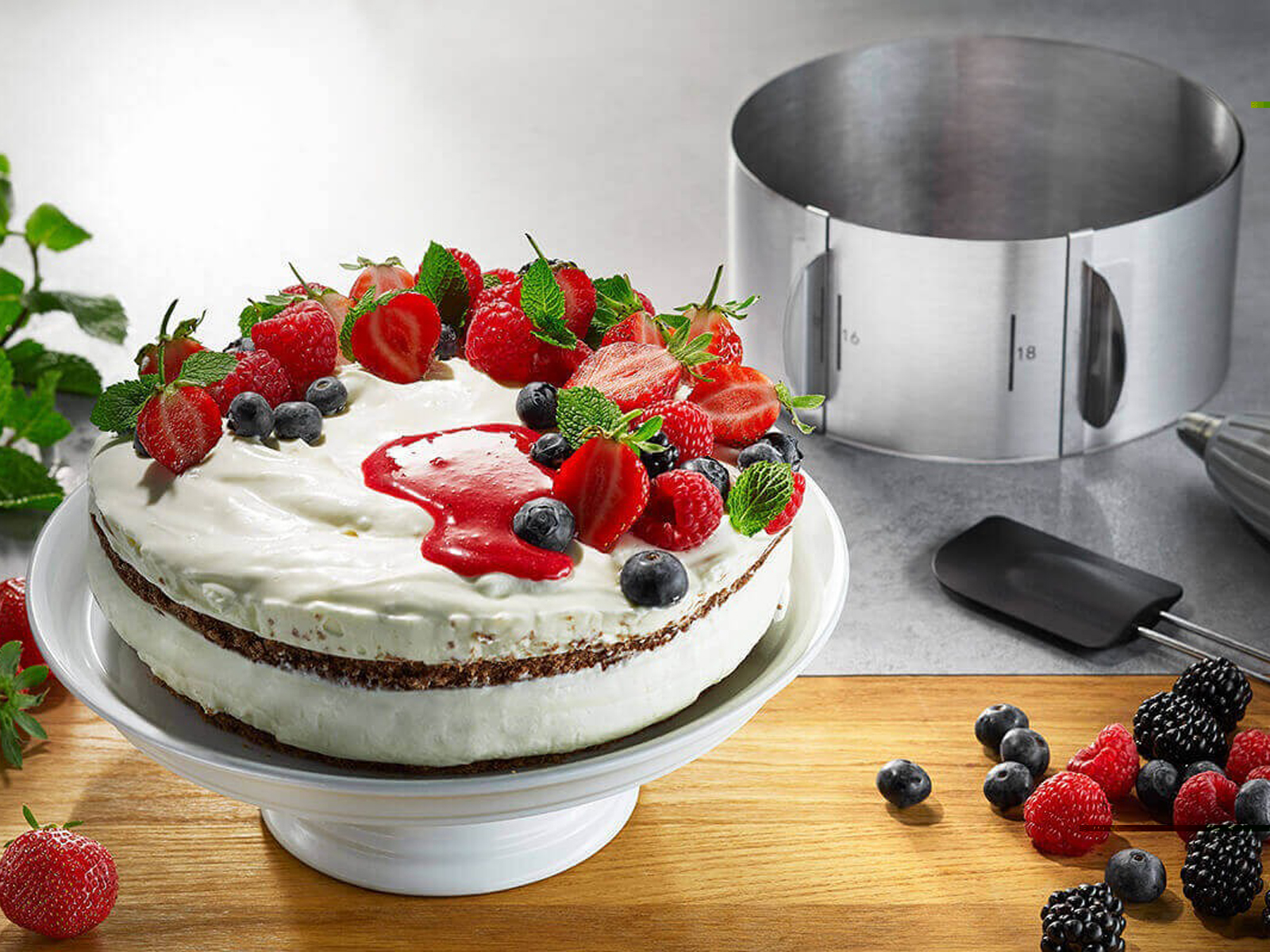 Obręcz GEFU Tondo to uniwersalna forma przeznaczona do tortów, ciast, zapiekanek i innych wypieków różnej wielkości. System regulacji ze skalą umożliwia płynne dostosowywanie średnicy w zakresie od 16 do 32 cm, a praktyczne uchwyty pomagają zatrzymać obręcz w wybranym rozmiarze. Wykonanie ze stali nierdzewnej gwarantuje trwałość i odporność na korozję. Dodatkowo, możliwość całkowitego otwarcia i rozłożenia konstrukcji znacznie upraszcza jej czyszczenie po każdym użyciu.