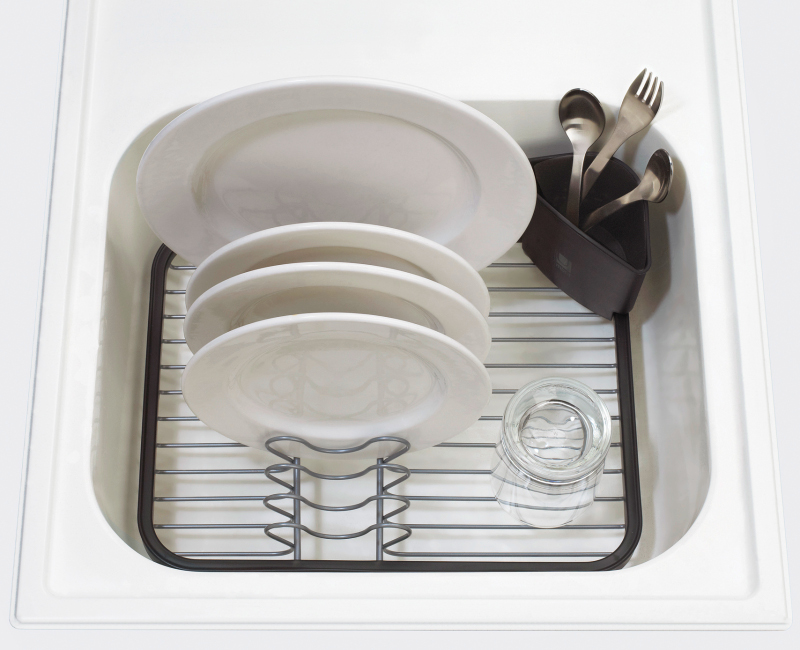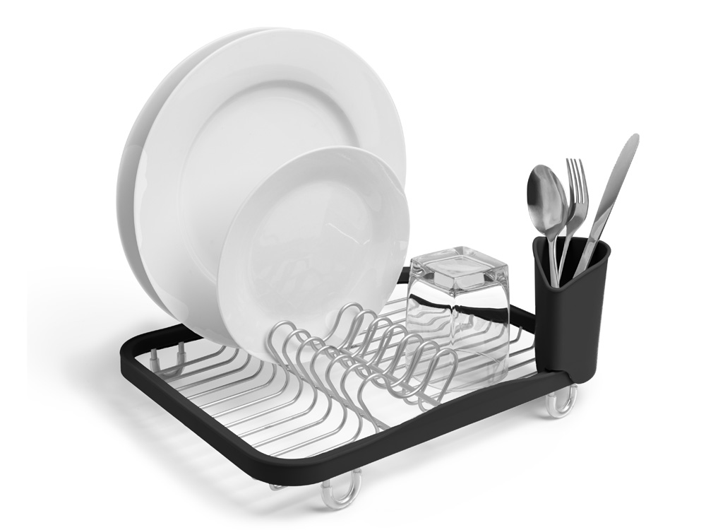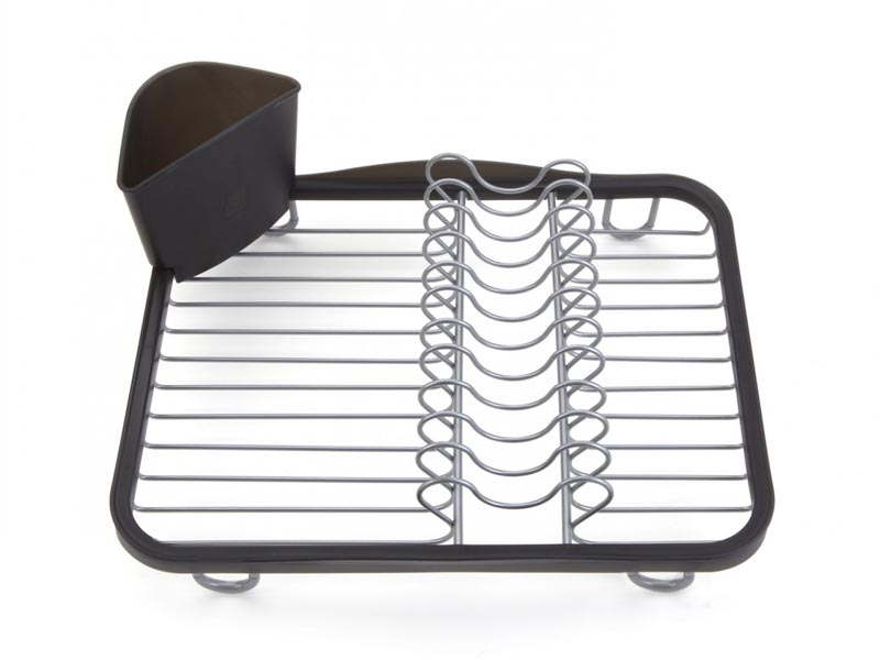 Praktyczna zlewowa suszarka do naczyń z ażurowym metalowym ociekaczem i trójkątnym wysokim pojemnikiem na sztućce.