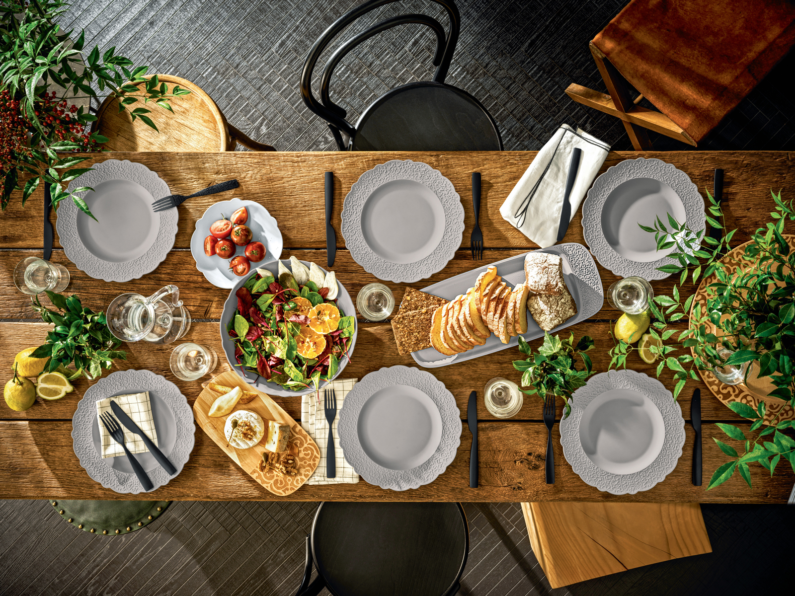 Linia En Plein Air z kolekcji Dressed to przemyślana propozycja dla wielbicieli posiłków oraz kameralnych spotkań na łonie natury. Składa się z naczyń wykonanych z melaminy, przeznaczonych do jedzenia i picia poza domem. Wyjątkiem są szklanki stworzone z żywicy termoplastycznej. Co ważne, naczynia w szarych lub białych wariantach kolorystycznych zdobione są reliefowymi dekoracjami.
