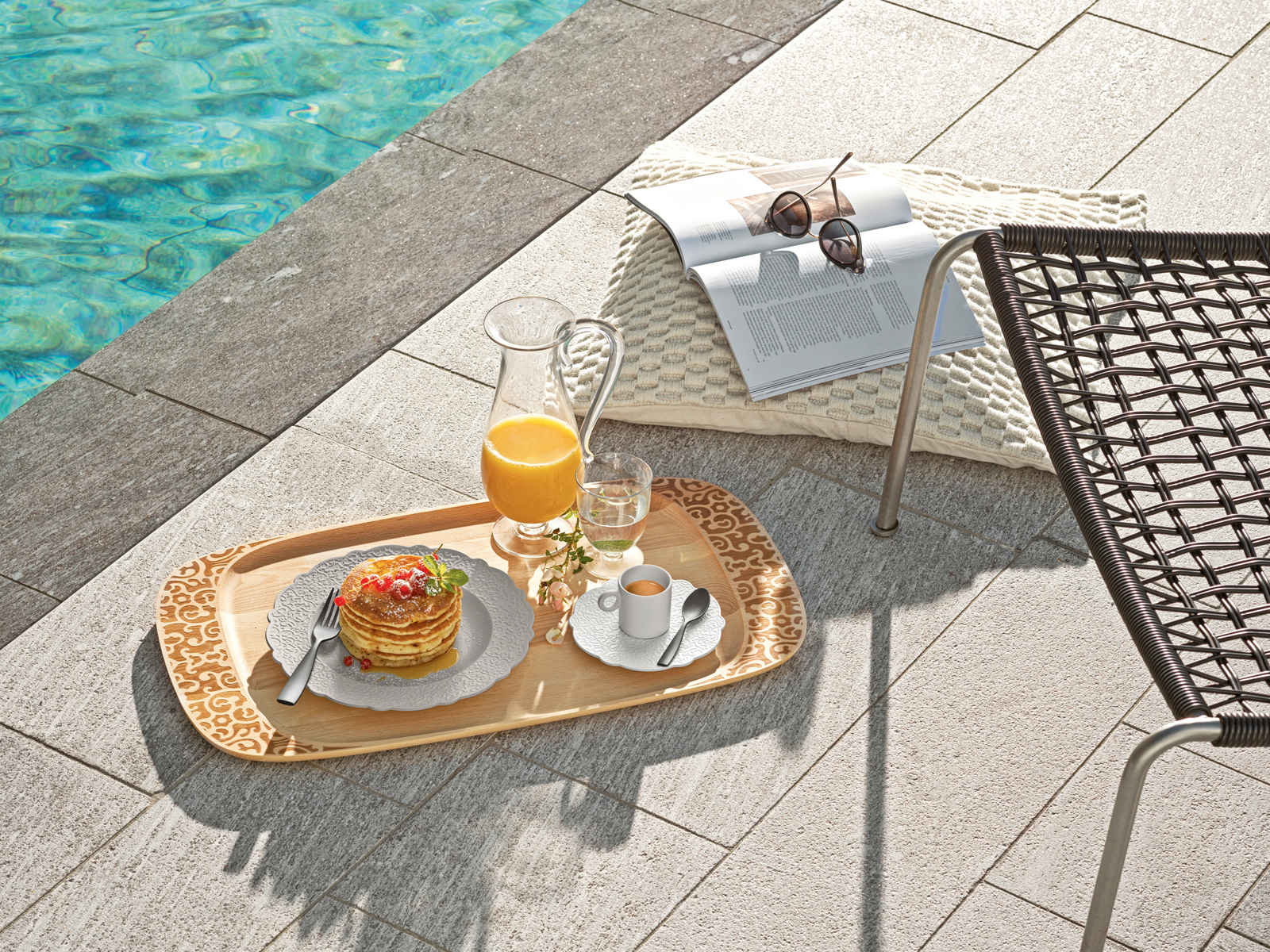 Linia En Plein Air z kolekcji Dressed to przemyślana propozycja dla wielbicieli posiłków oraz kameralnych spotkań na łonie natury. Składa się z naczyń oraz sztućców wykonanych z melaminy, przeznaczonych do jedzenia i picia poza domem. Wyjątkiem są szklanki stworzone z żywicy termoplastycznej. Co ważne, sztućce zdobione są od spodu reliefowymi dekoracjami.