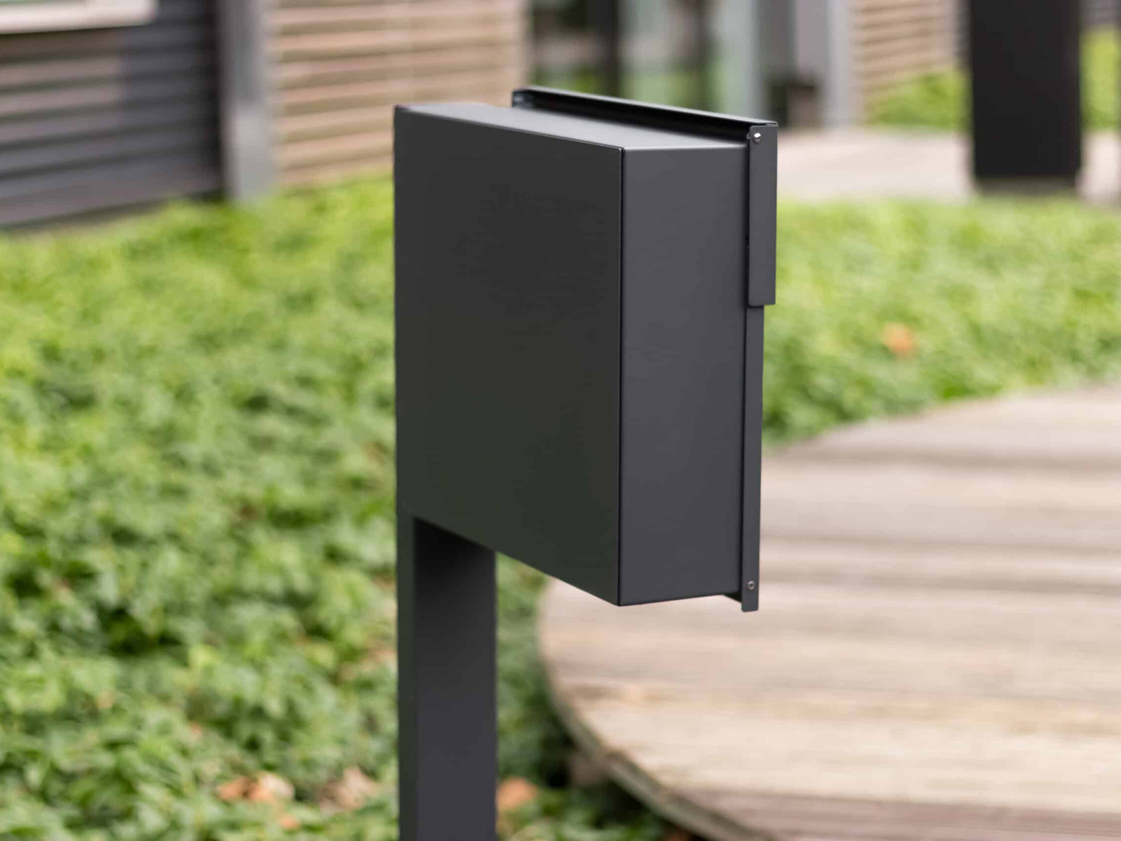 Elegancka stojąca metalowa skrzynka na listy umocowana na słupku montowanym do podłoża.
