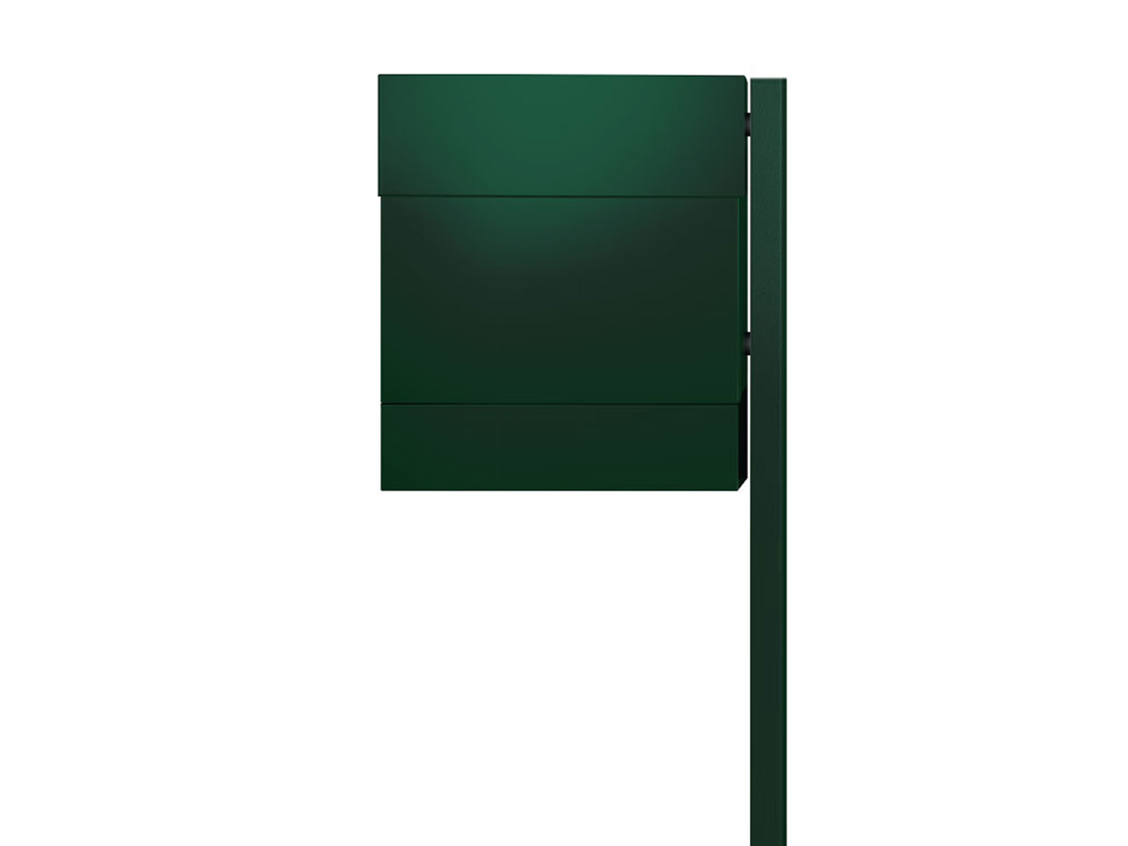 Elegancka stojąca metalowa skrzynka na listy z gazetownikiem umocowana na słupku montowanym do podłoża.