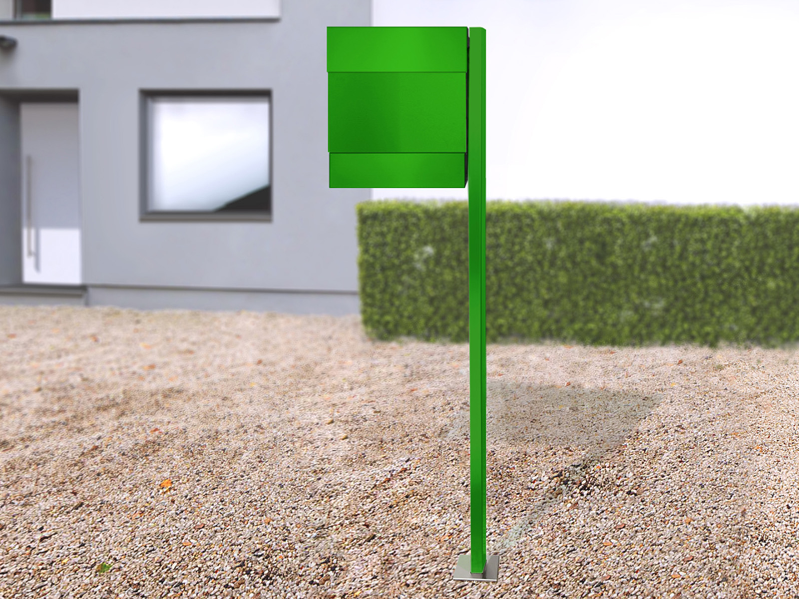 Słupek skrzynki o wysokości 144 cm z małą prostokątną podstawą, można go zamocować do podłoża na 2 sposoby: za pomocą 4 śrub lub za pomocą kotwy gruntowej - w obu wariantach połączenia śrubowe na podstawie słupka są zakryte dołączoną płytą osłonową.