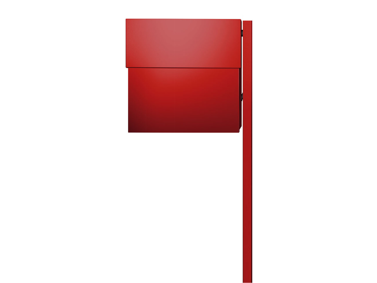 Elegancka stojąca metalowa skrzynka na listy umocowana na słupku montowanym do podłoża.