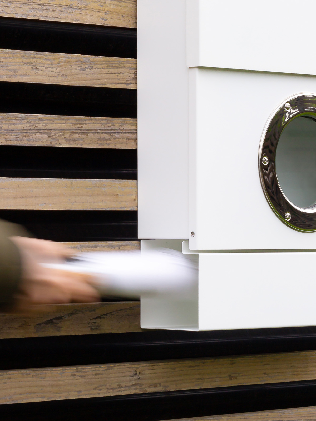 Przednia ścianka skrzynki posiada okrągłe szklane okienko z ozdobnym brzegiem przypominające bulaj, które umożliwia identyfikację z zewnątrz czy w skrzynce znajdują się listy.