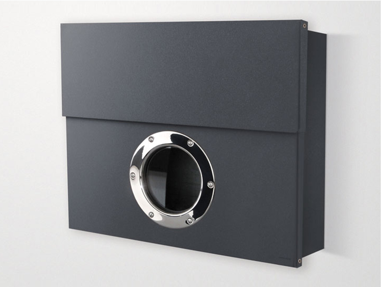 Elegancka i oryginalna metalowa duża skrzynka na listy XXL z efektownym okrągłym okienkiem oraz wewnętrznym gazetownikiem.