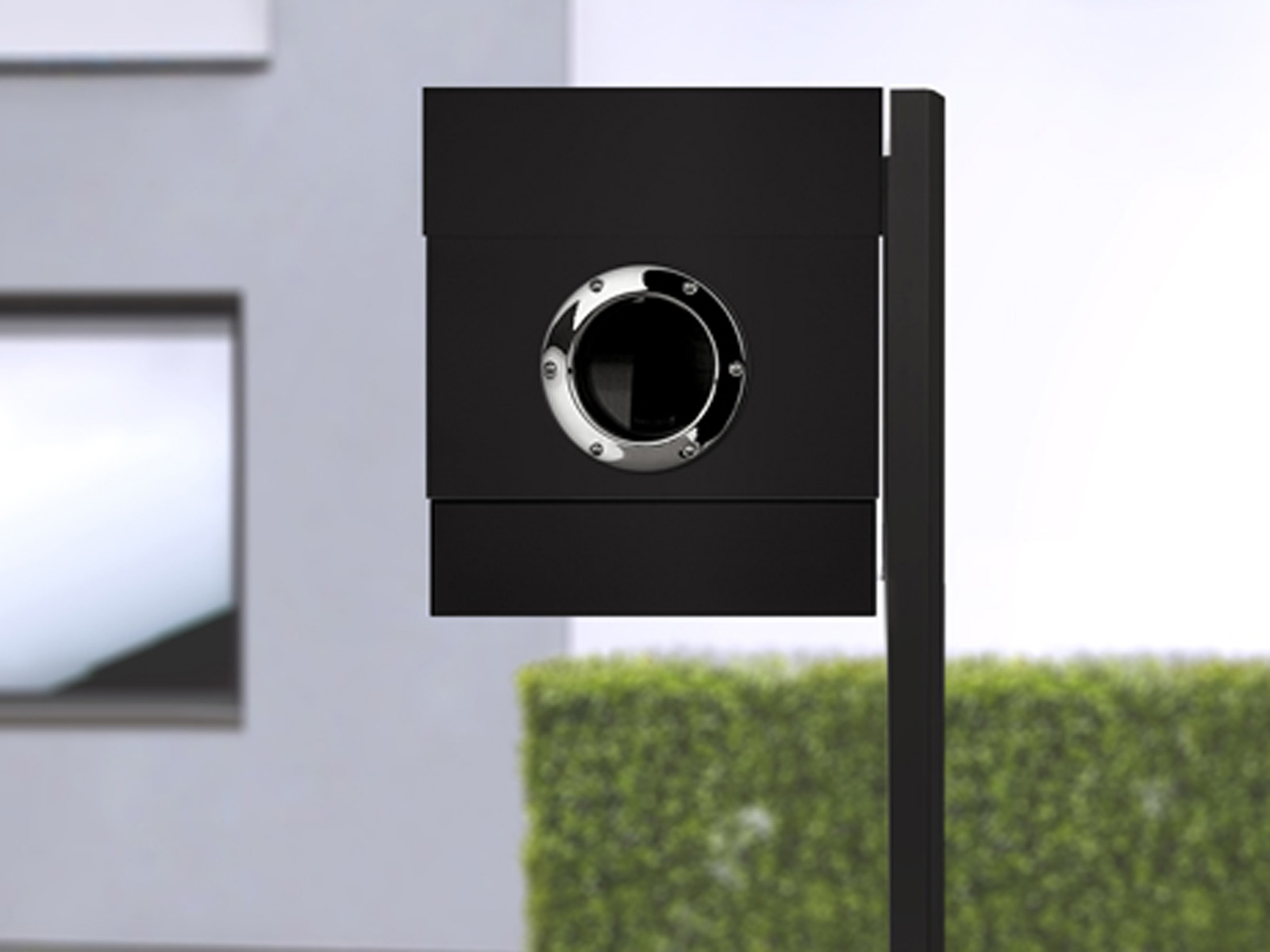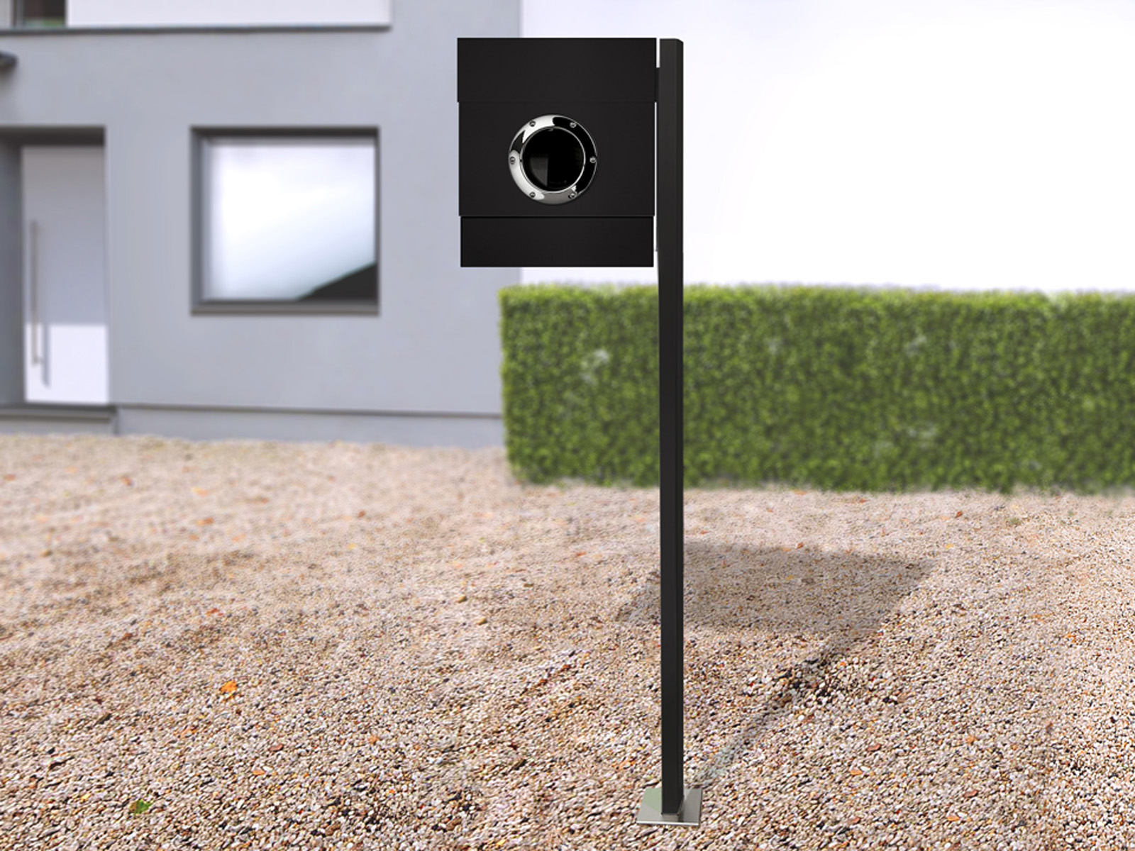 Elegancka i oryginalna stojąca metalowa skrzynka na listy z efektownym okrągłym okienkiem oraz gazetownikiem.