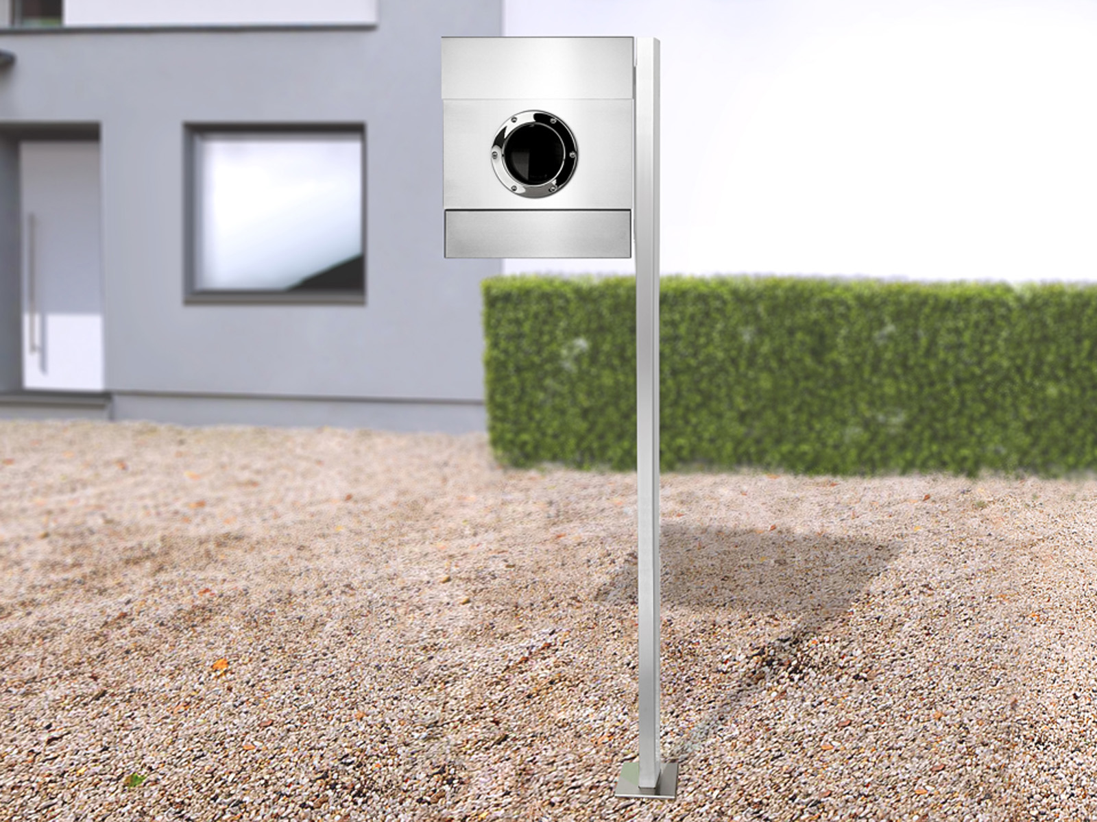 Elegancka i oryginalna stojąca metalowa skrzynka na listy z efektownym okrągłym okienkiem oraz oraz gazetownikiem.